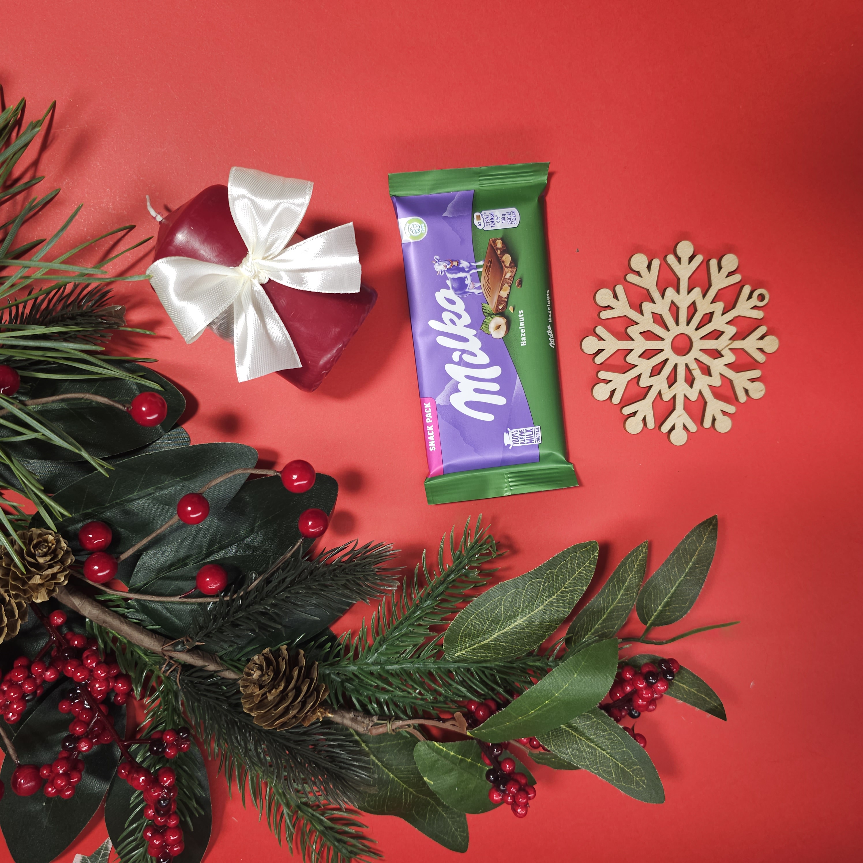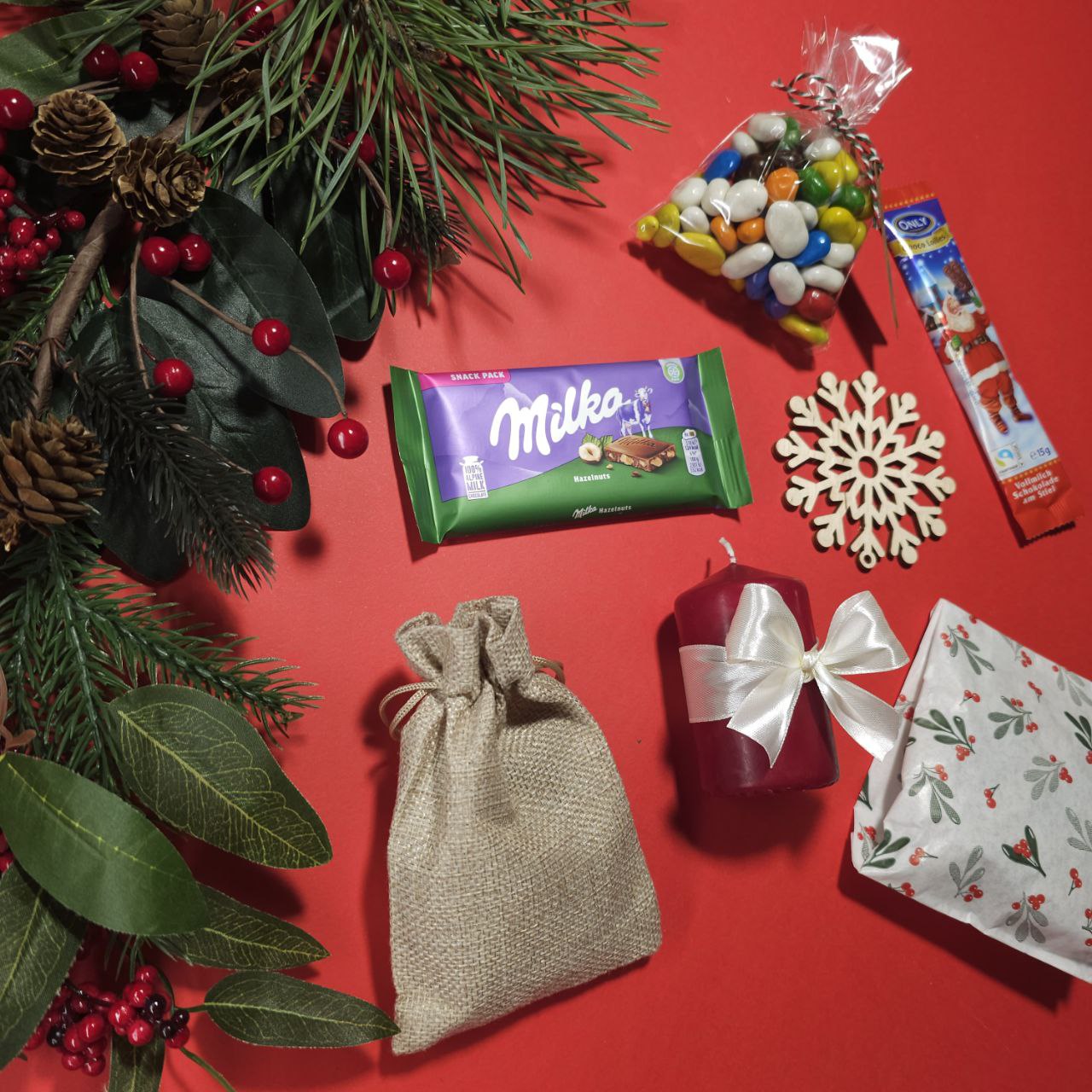 Солодощі: - Шоколад Milka (snack pack) — ніжний молочний шоколад, що дарує насолоду кожному поціновувачу солодкого - Різнокольорове шоколадне драже — яскравий акцент, який додає святкової радості - Цукерка Only Choco Sticks із Сантою — святковий шоколад у різдвяній обгортці, який підкреслює атмосферу свята - Запашна кава — тепла, ароматна, ідеальна для зимового вечора