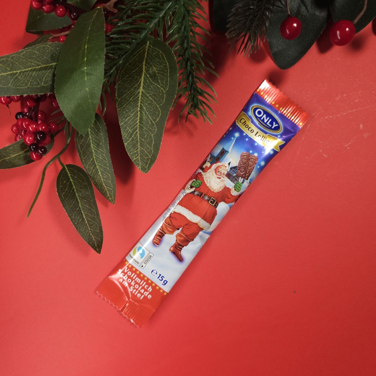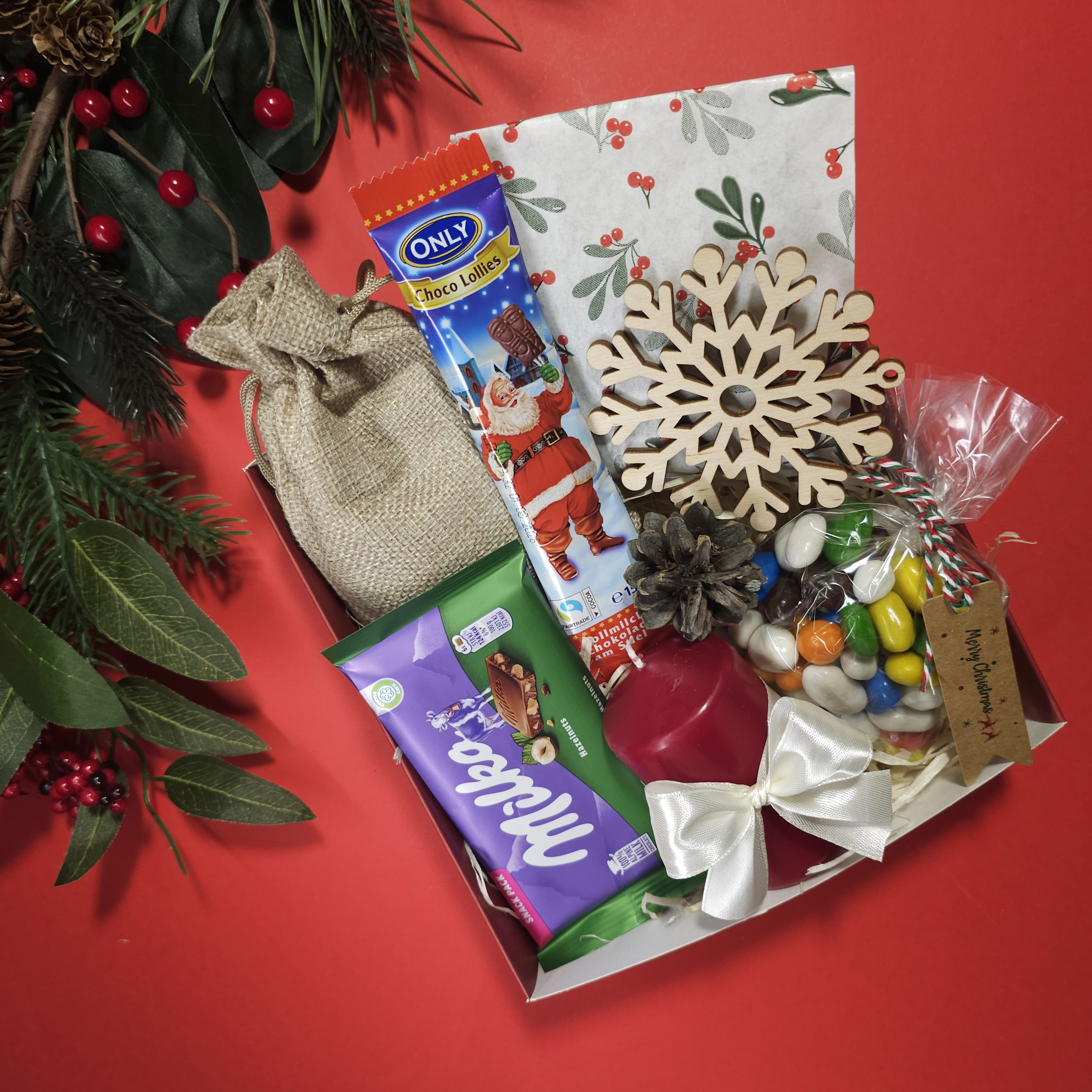 Солодощі: - Шоколад Milka (snack pack) — класичний молочний шоколад із ніжним смаком, який підкорює з першого шматочка - Різнокольорове шоколадне драже — яскраві цукерки, що додають настрою й нагадують про дитинство - Цукерка Only Choco Sticks із Сантою — святковий шоколад у новорічному дизайні - Смачнюче какао — напій, що дарує затишок і тепло зимового вечора