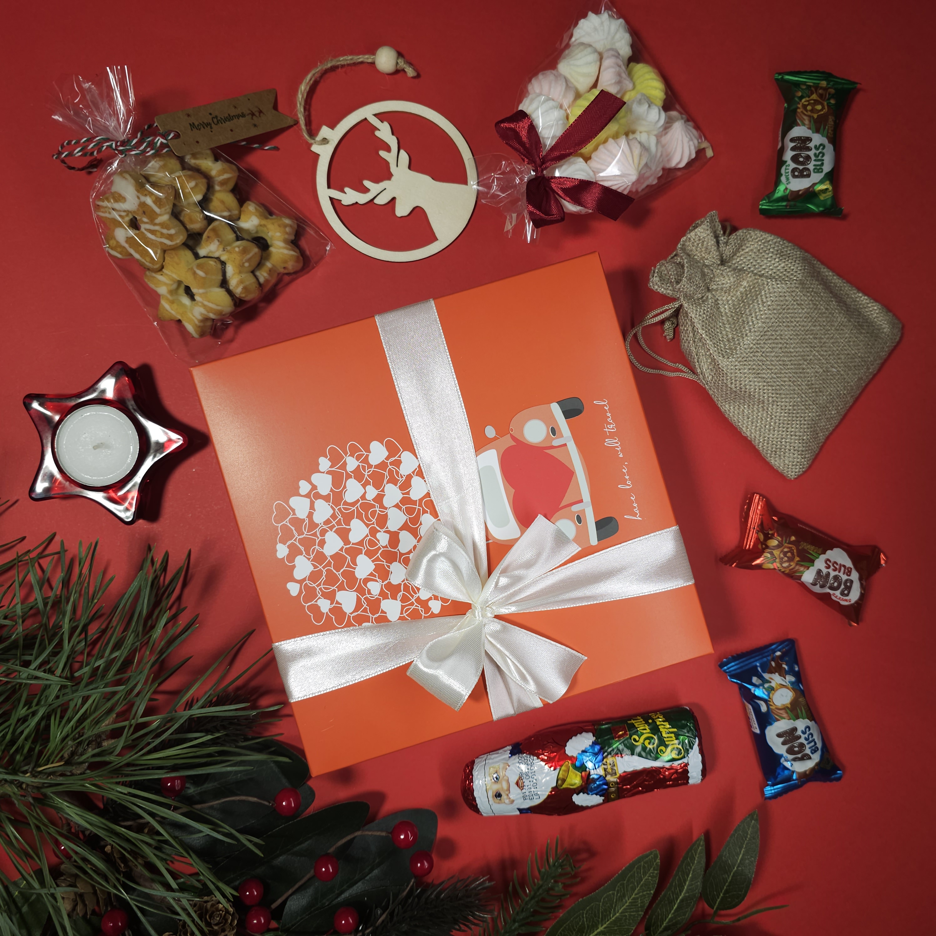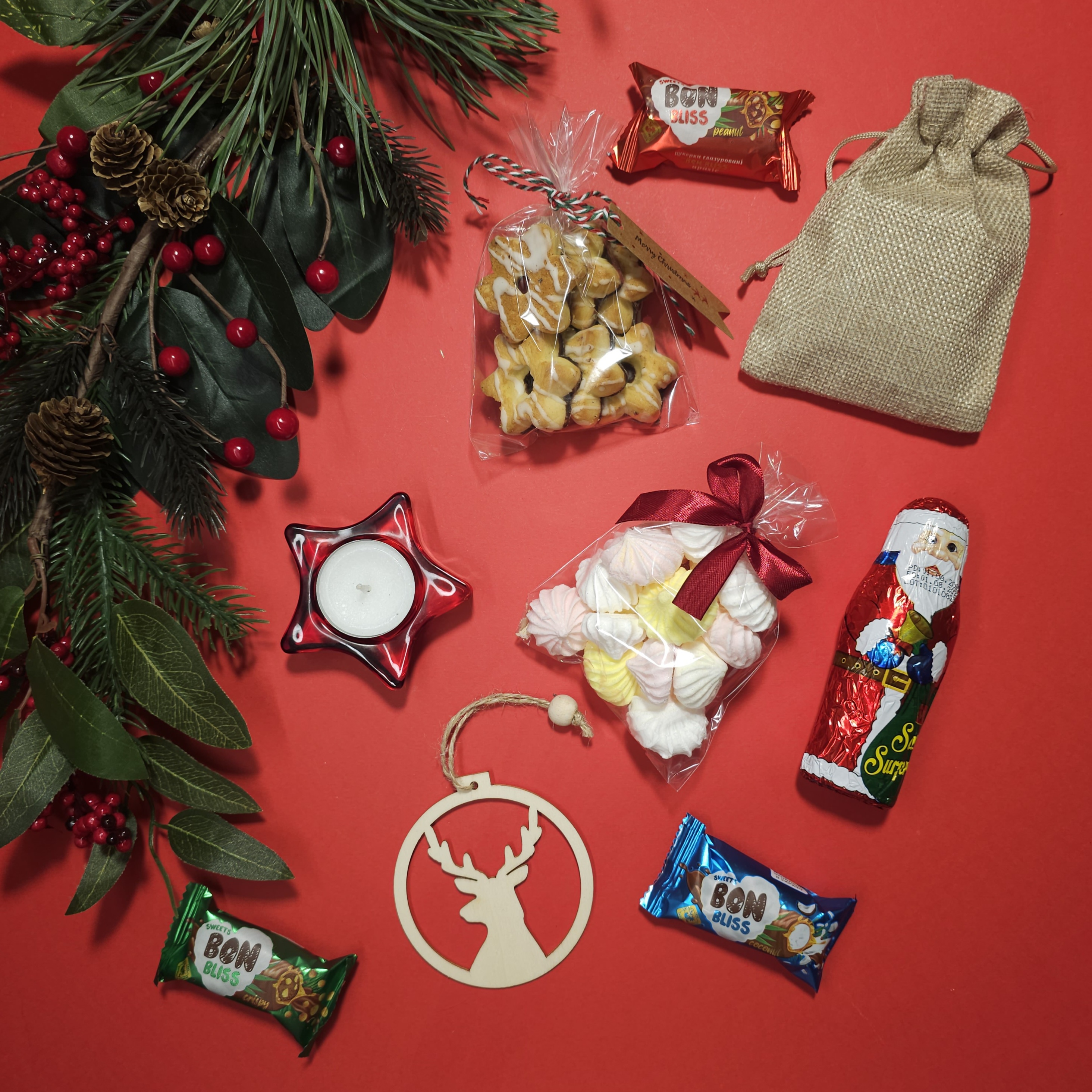 Солодощі: - Смачне пісочне печиво — ароматне, розсипчасте та ідеальне до чаю - Хрумке бізе — легке, ніжне, тане в роті, додаючи солодкої нотки настрою - Шоколадна фігурка Санти — класичний Новогороку, що створює атмосферу свята - Цукерки Bon Bliss — поєднання ніжної начинки, хрустких рисових кульок і тонкої шоколадної глазурі, 3 шт. - Зігріваючий чай із квітково-фруктовим ароматом — натуральний, ароматний, ідеальний для прохолодних зимових вечорів