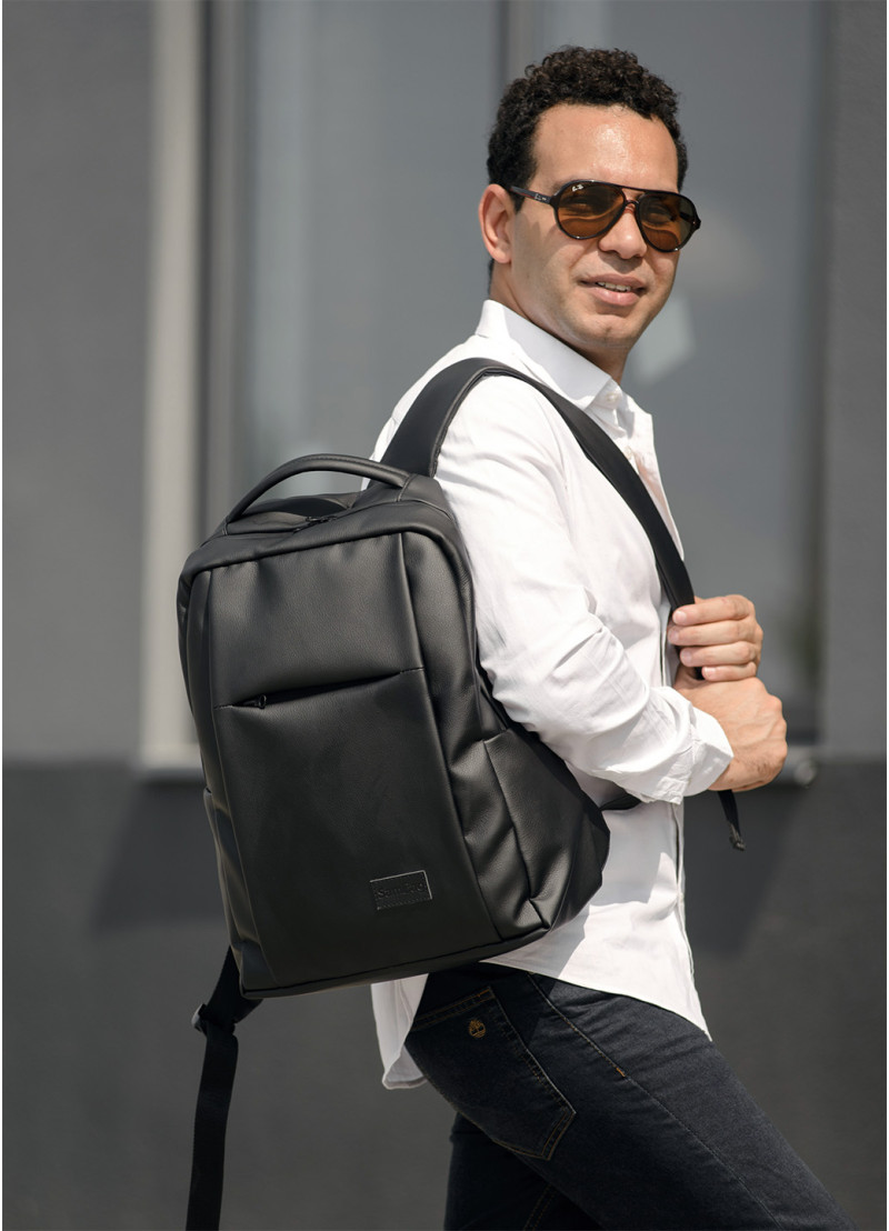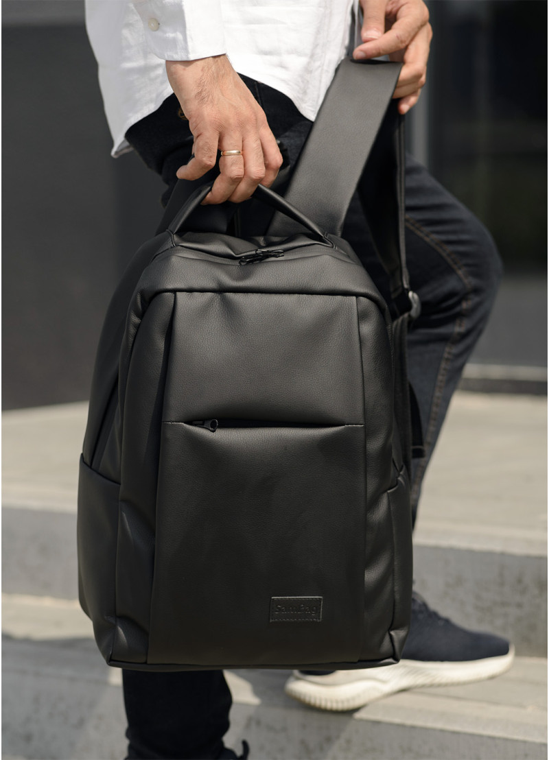 Рюкзак виготовлений з новітньої екошкіри підвищеного рівня зносостійкості з матеріалу, який пройшов тест на Мертиндейлі з не менше ніж 50 000 циклів. Шкіра є водовідштовхуючою, стійкою до вицвітання та еластичною, тому вона не тріскається при експлуатації та міцна на розрив. Спинка рюкзака також ущільнена піноматеріалом, що дозволяє рюкзаку зберігати свою форму.
