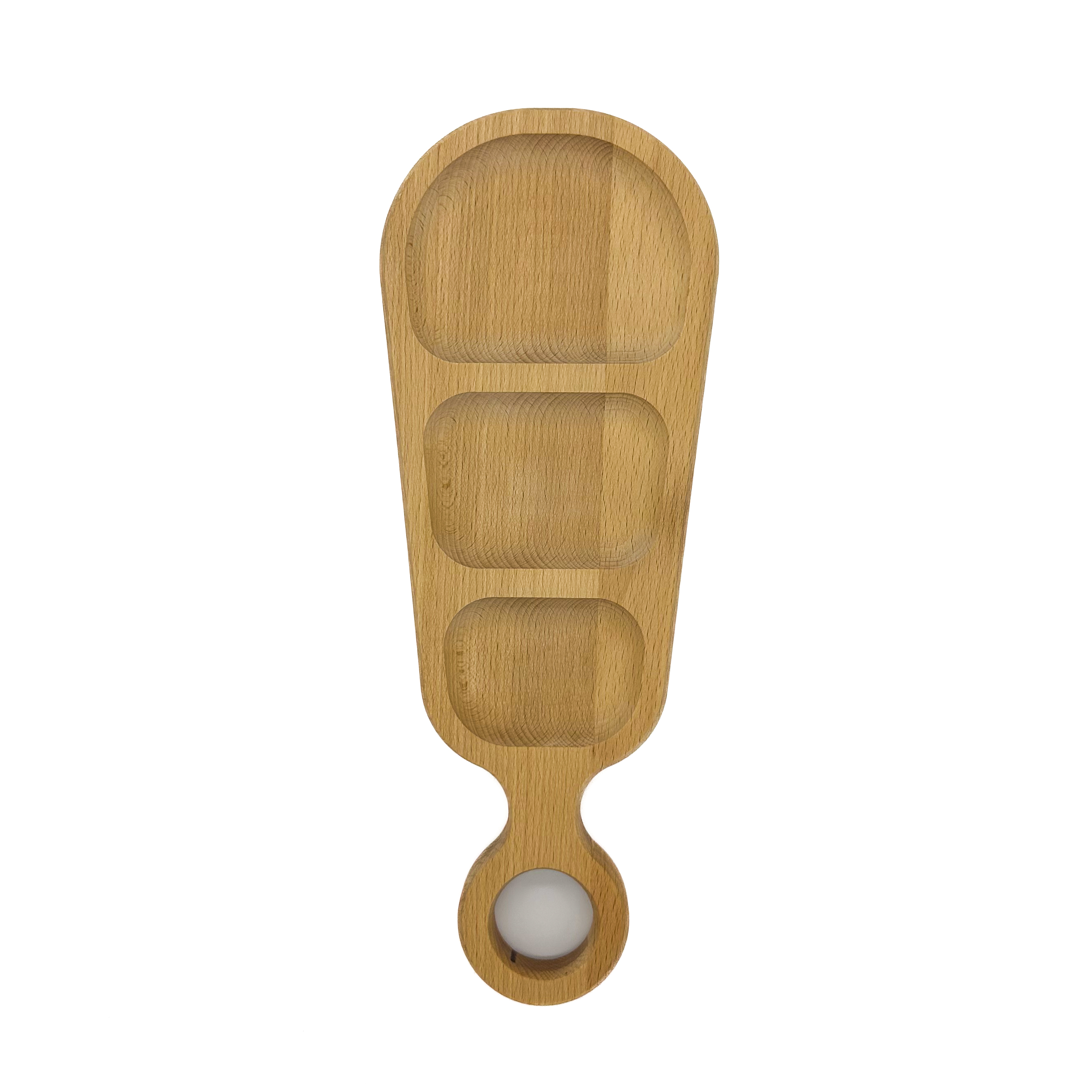 Догляд за дерев'яною менажницею - це легка та приємна задача. Вона не потребує особливих зусиль, оскільки з легкістю миється мильним розчином. Завдяки своєму чудовому дизайну із 3 відділеннями, вона дозволяє зручно розміщувати страви та додатки, що замінить необхідність використовувати багато тарілок. Також, вона може служити чудовою дерев'яною тацею для подачі страв.