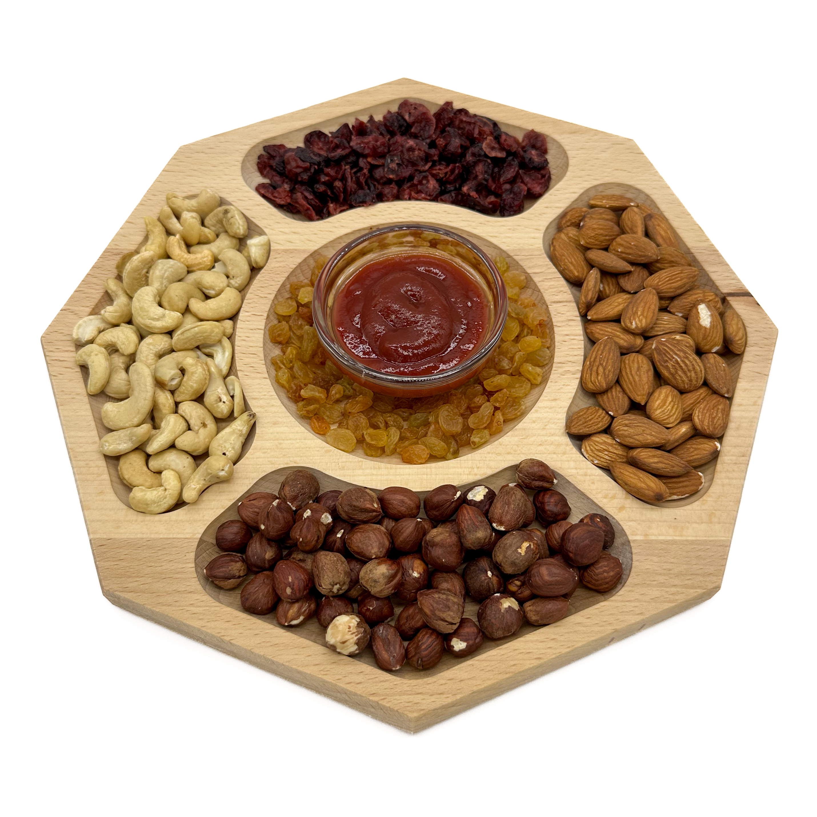 Наша дерев'яна менажниця виготовлена з високоякісного 100% масиву дерева, що надає їй неперевершену зносостійкість та довговічність. Важливо відмітити, що деревина - це екологічно чистий матеріал, який не містить шкідливі речовини, гарантуючи абсолютну безпеку при контакті з їжею.