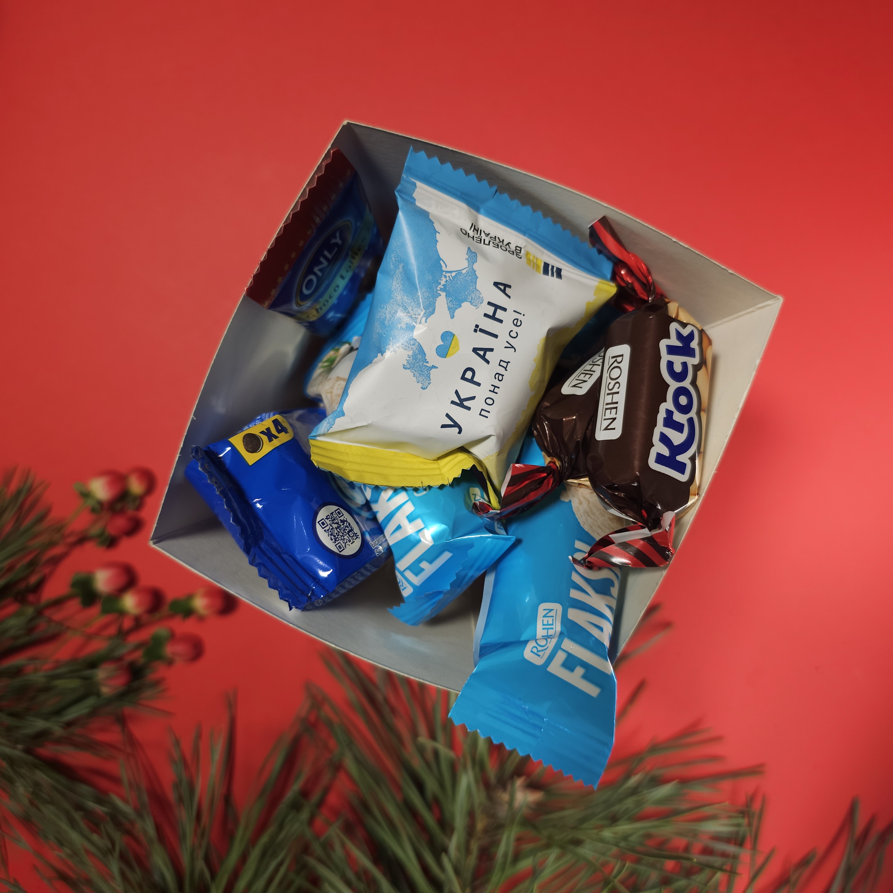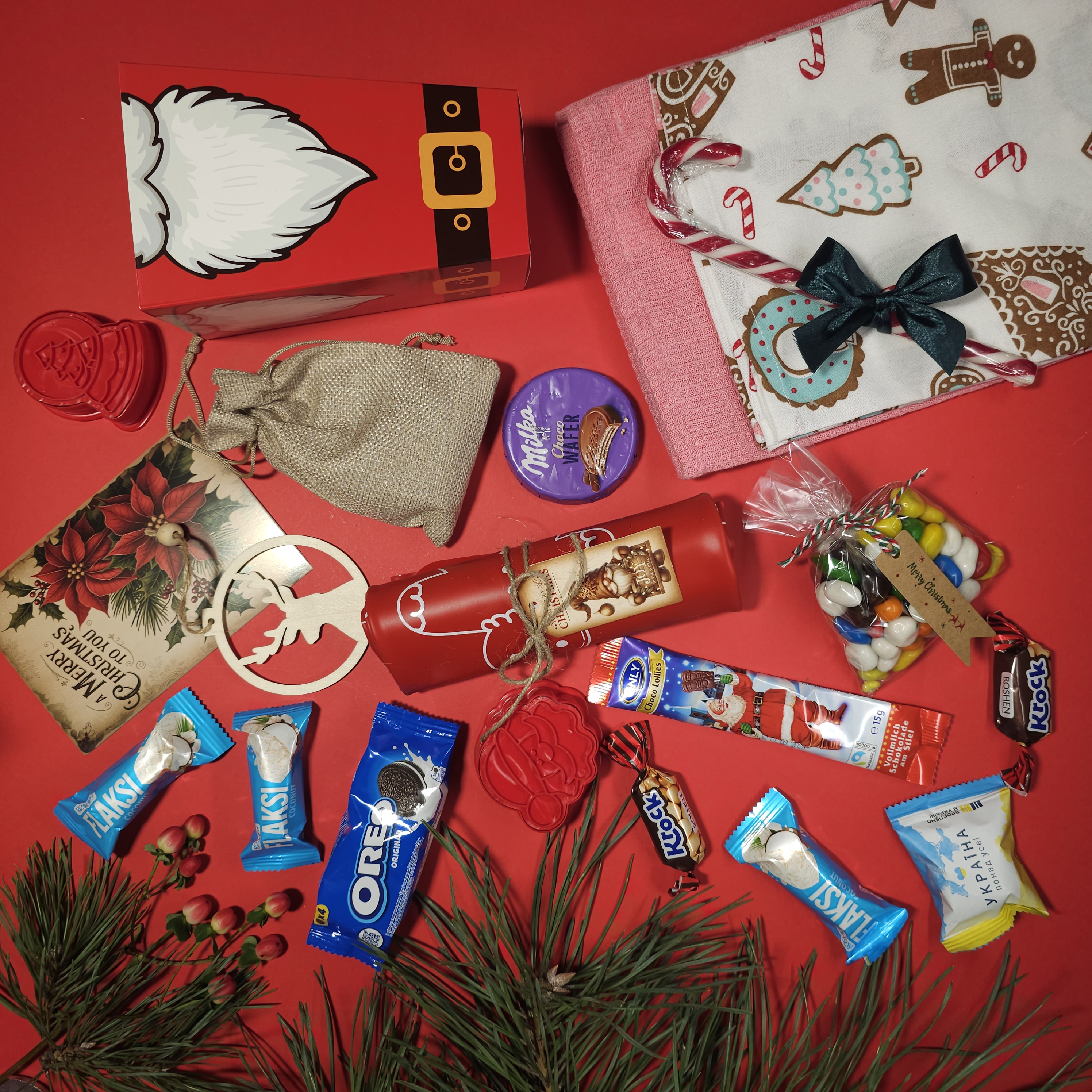 - Milka Choco Wafer – шоколадна вафелька від Milka. - Oreo Original – класичне печиво з кремовою начинкою. - Only Choco Tales – шоколадна паличка з різдвяним дизайном "Санта" - Krock – цукерки з хрусткою арахісово-карамельною пастою в какао-глазурі, 2 шт. - Flaksi – вафельні цукерки з пластівцями та кокосом, 2 шт. - Цукерка “любіть Україну” – в кондитерській глазурі. - Шоколадне різнокольорове драже. - Карамельний льодяник у формі тростини – класична святкова цукерка з червоно-білими смужками. - Чай з фруктово-квітковими нотками та натуральними добавками.