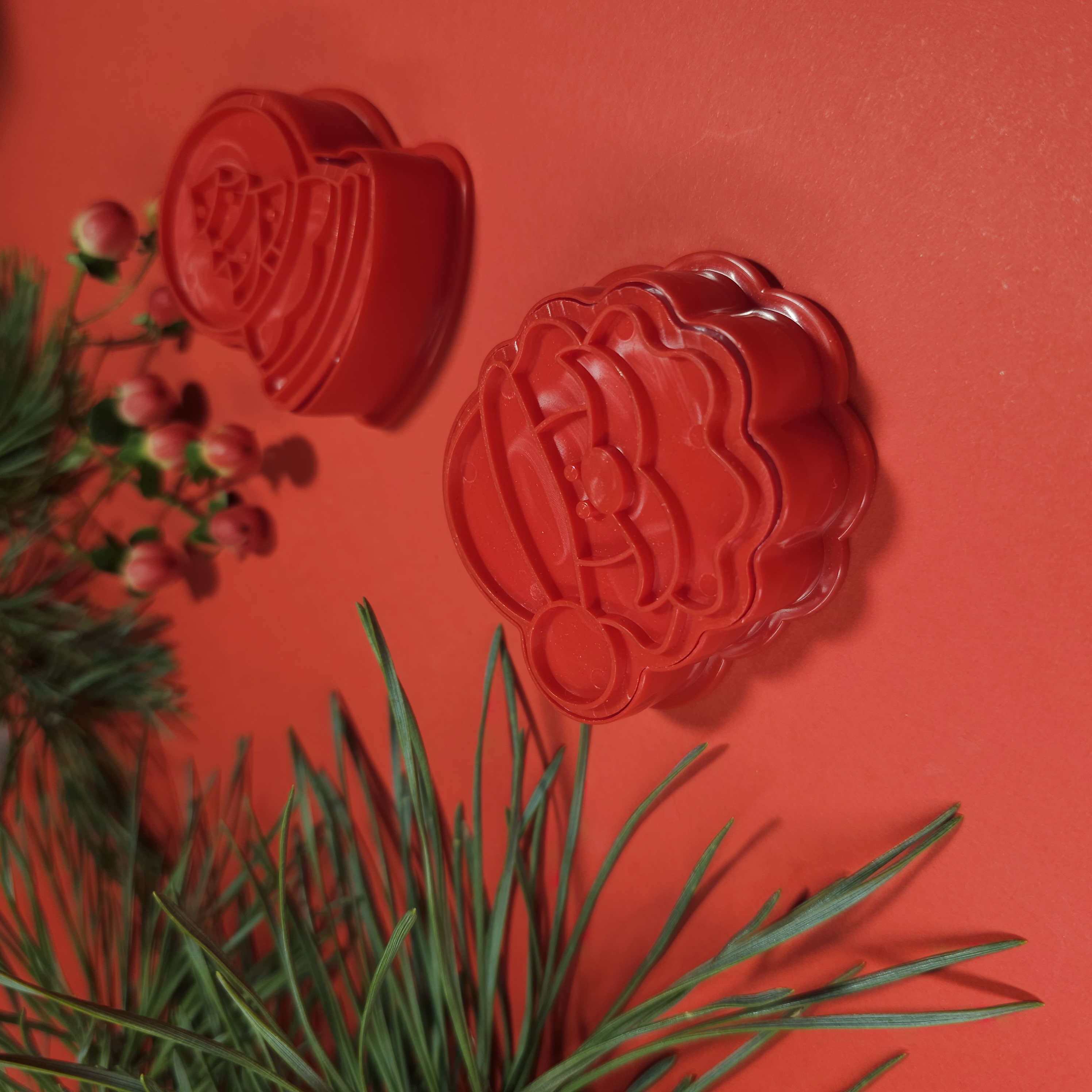 - Силіконовий килимок для випікання з святковим дизайном. - Пластикові печатки для пряників або печива з святковою символікою. - Новорічний рушник із святковим принтом, 2 шт. - Картонний стакан для смаколиків у вигляді костюма Санти. - дерев'яна ялинкова іграшка. - Святкова листівка.