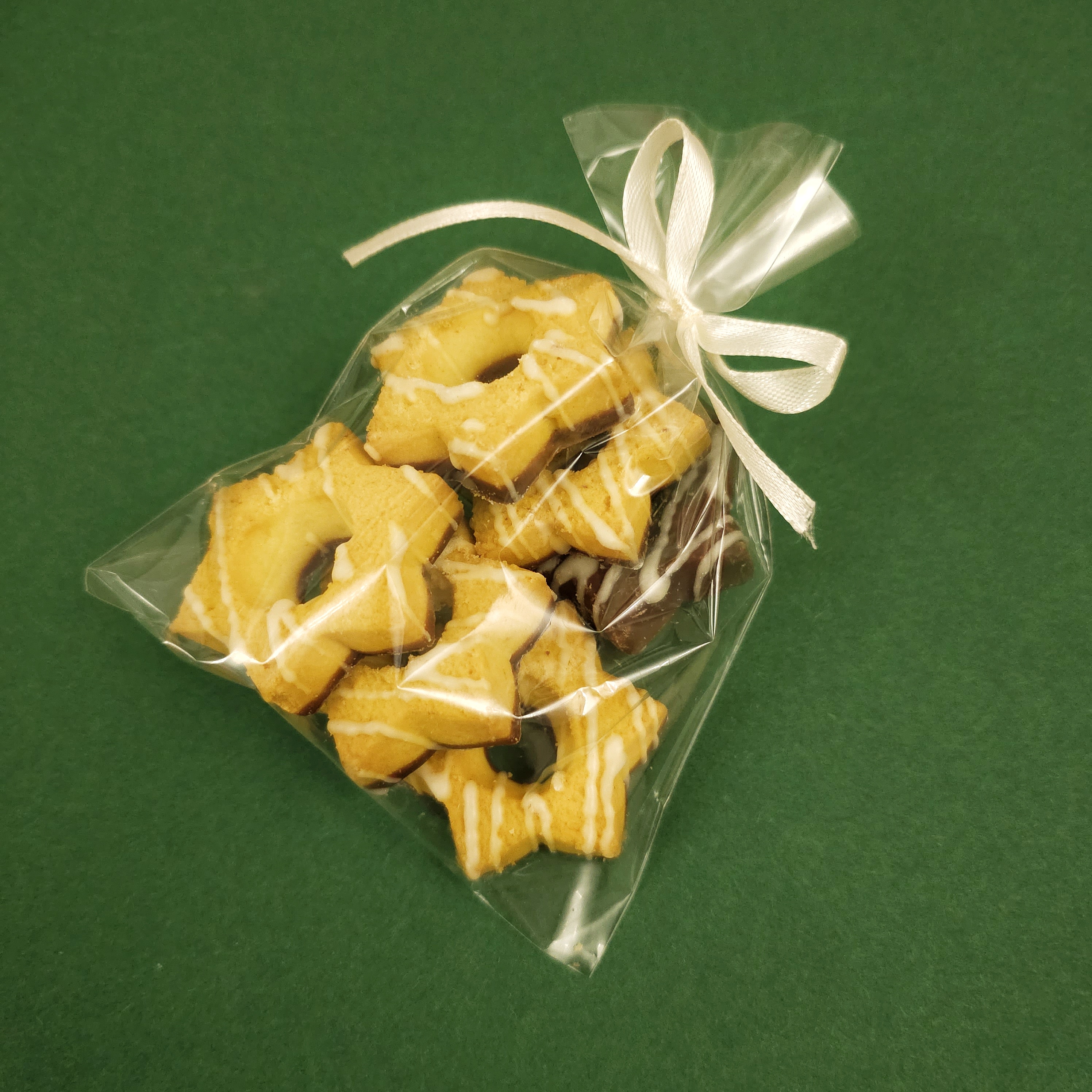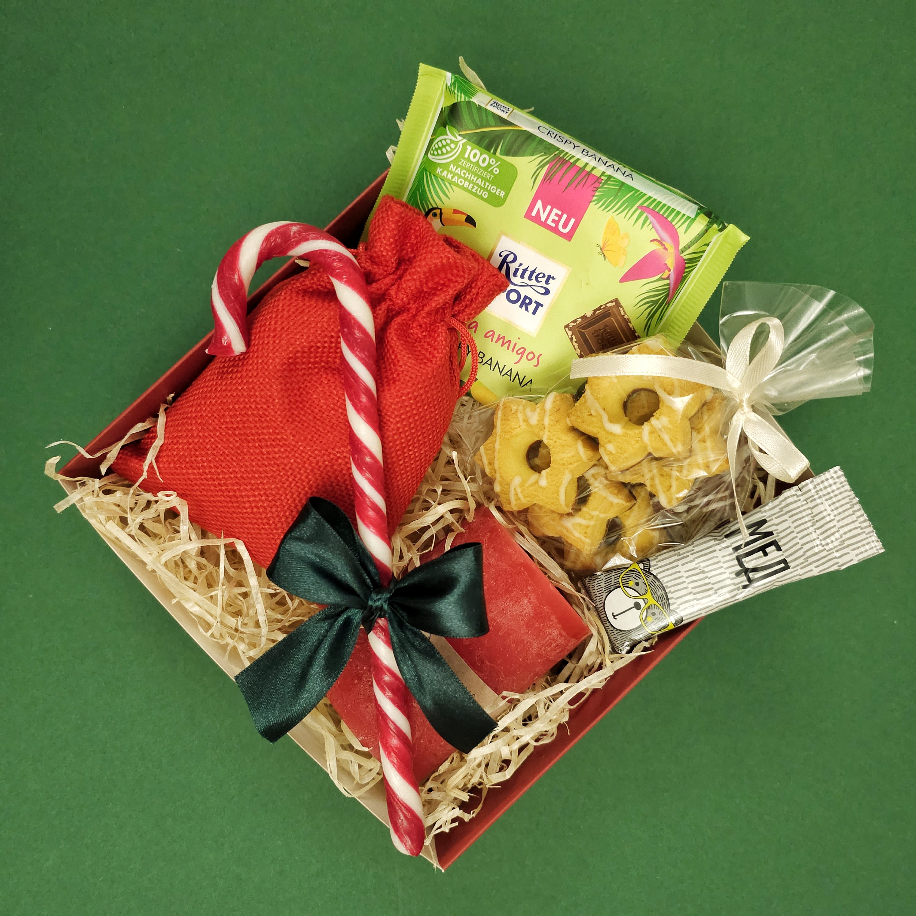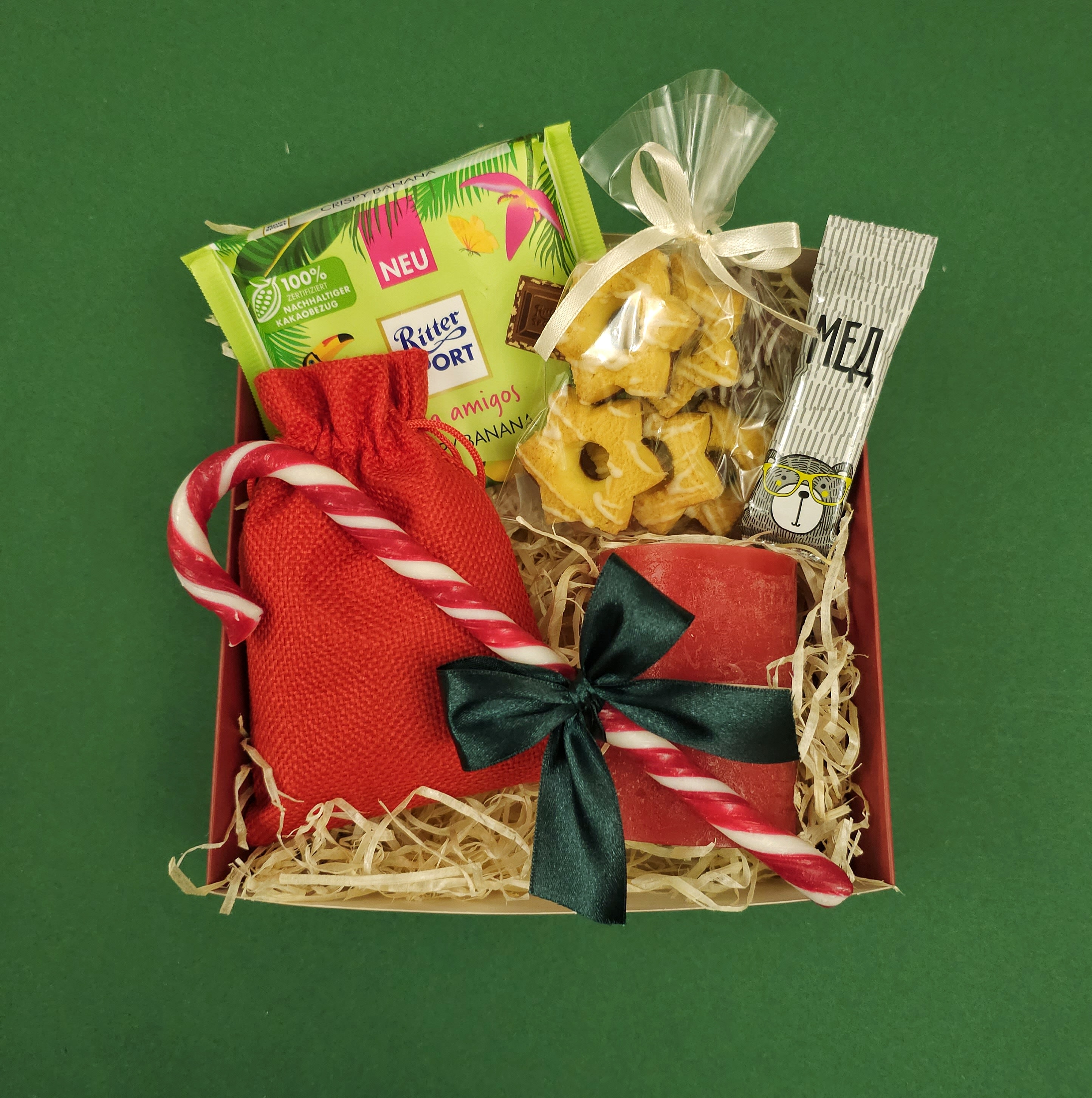 - чай з квітами та шматочками фруктів - шоколад Ritter Spot - смачнюче печиво - карамельний льодяник - мед - свічка для святкової атмосфери - дерев'яна іграшка