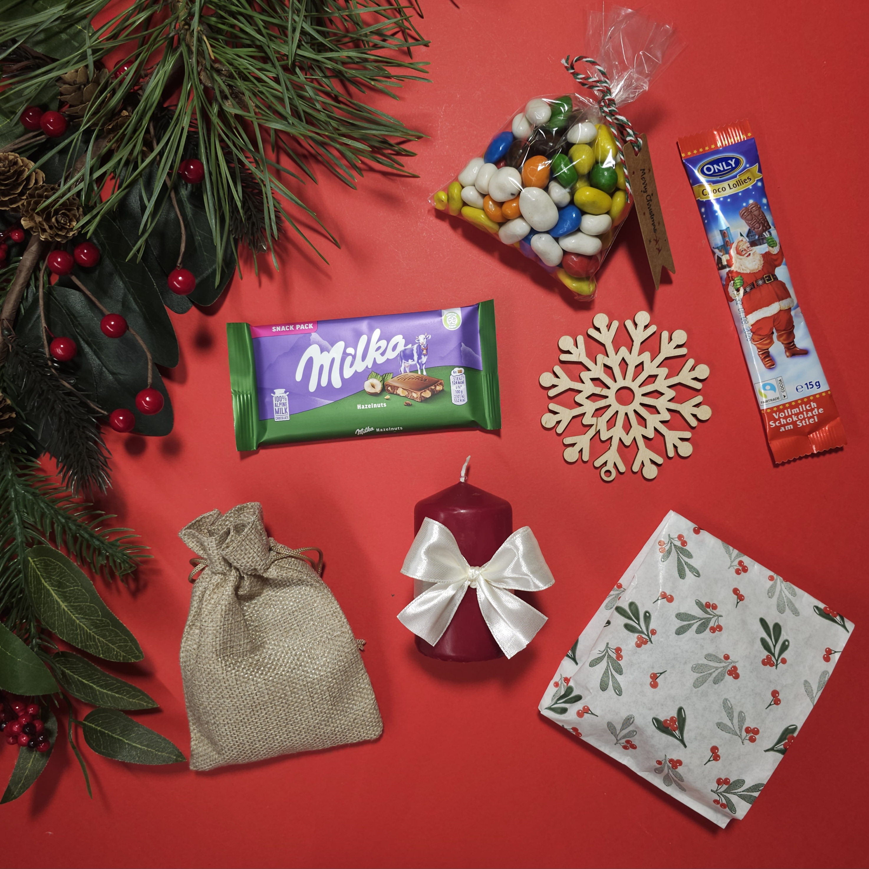 Солодощі: - Шоколад Milka (snack pack) — ніжний молочний шоколад, що дарує насолоду кожному поціновувачу солодкого - Різнокольорове шоколадне драже — яскравий акцент, який додає святкової радості - Цукерка Only Choco Sticks із Сантою — святковий шоколад у різдвяній обгортці, який підкреслює атмосферу свята - Ароматний листовий чай із фруктово-квітковим ароматом — теплий, запашний, ідеальний для зимового вечора