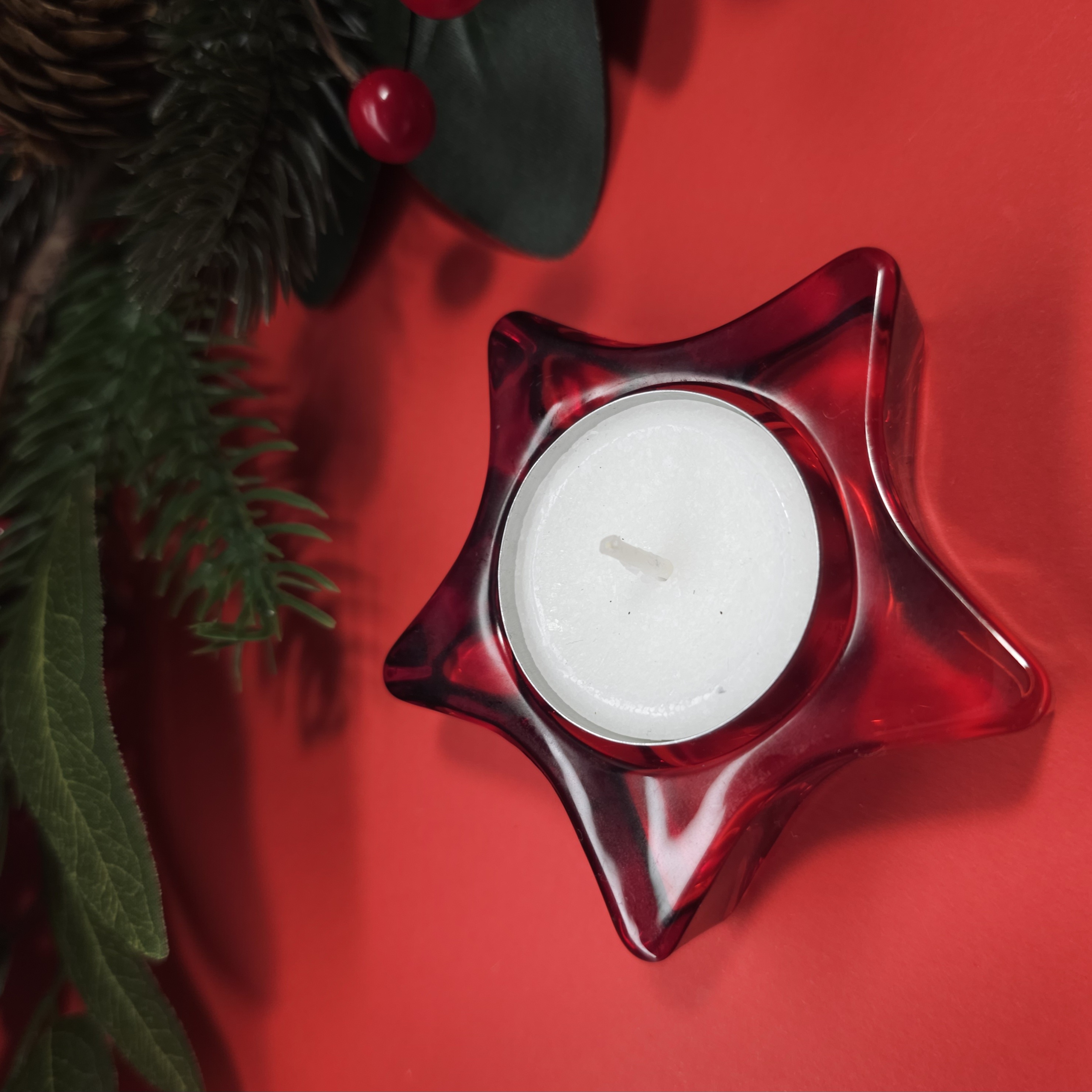Святкові аксесуари - Підсвічник у формі зірки з свічкою-таблеткою — створює м’яке світло та затишну атмосферу. - Дерев’яна ялинкова прикраса — витончена деталь, що доповнює новорічний декор.