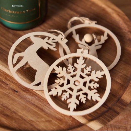 Святкові аксесуари: - Підсвічник у формі зірки зі свічкою-таблеткою — м’яке світло, що наповнює простір теплом і затишком. - Дерев’яна ялинкова прикраса — стильний штрих, який додає новорічного шарму.