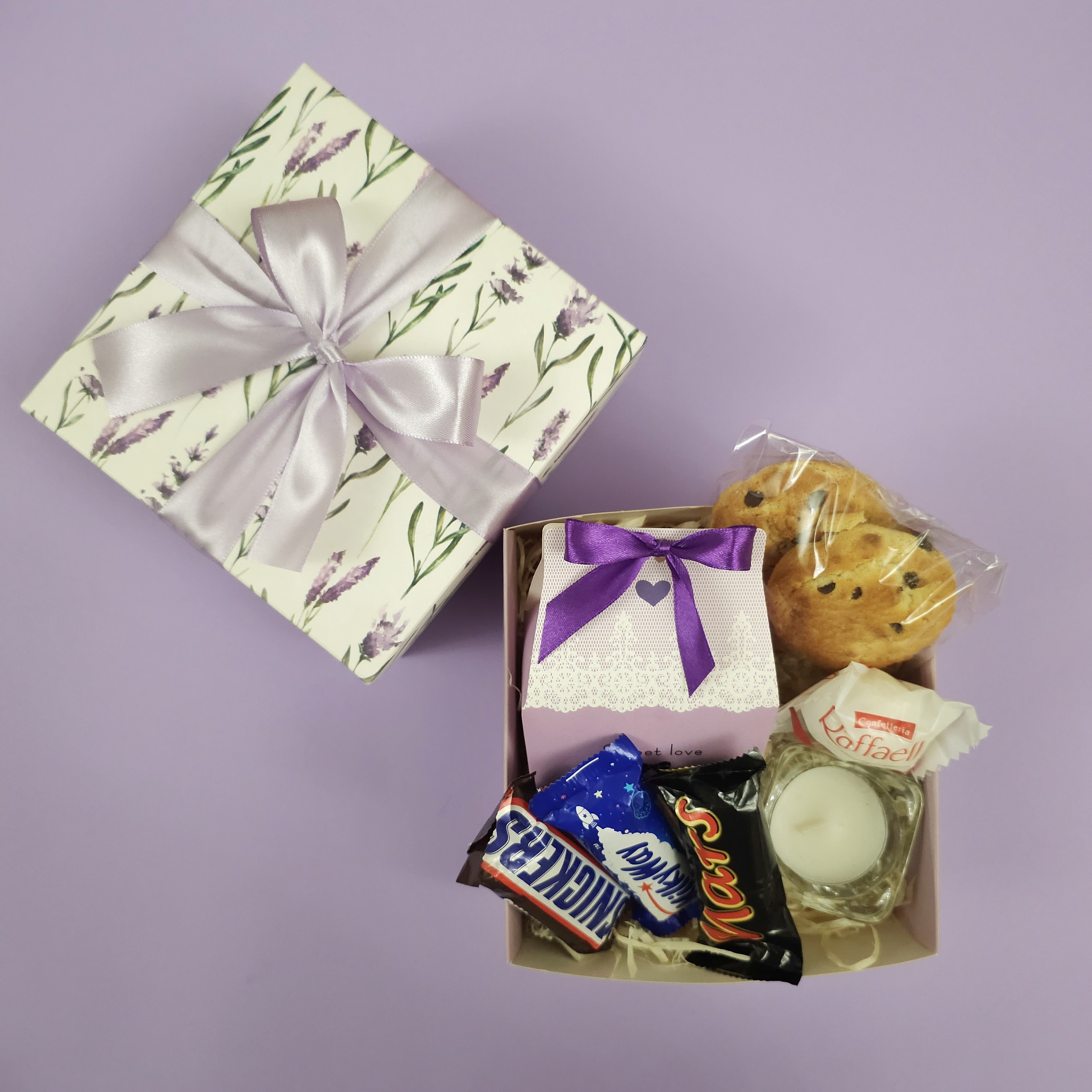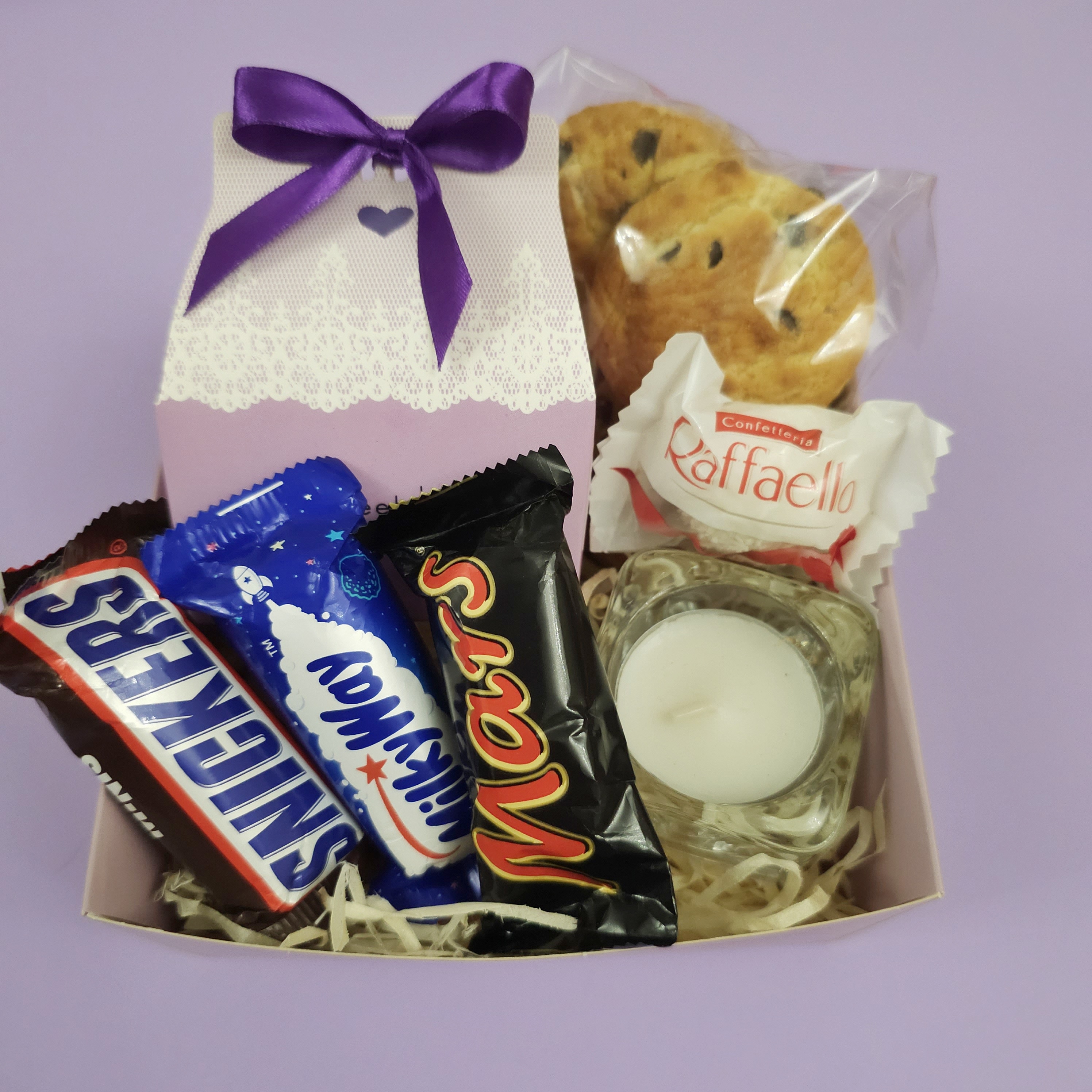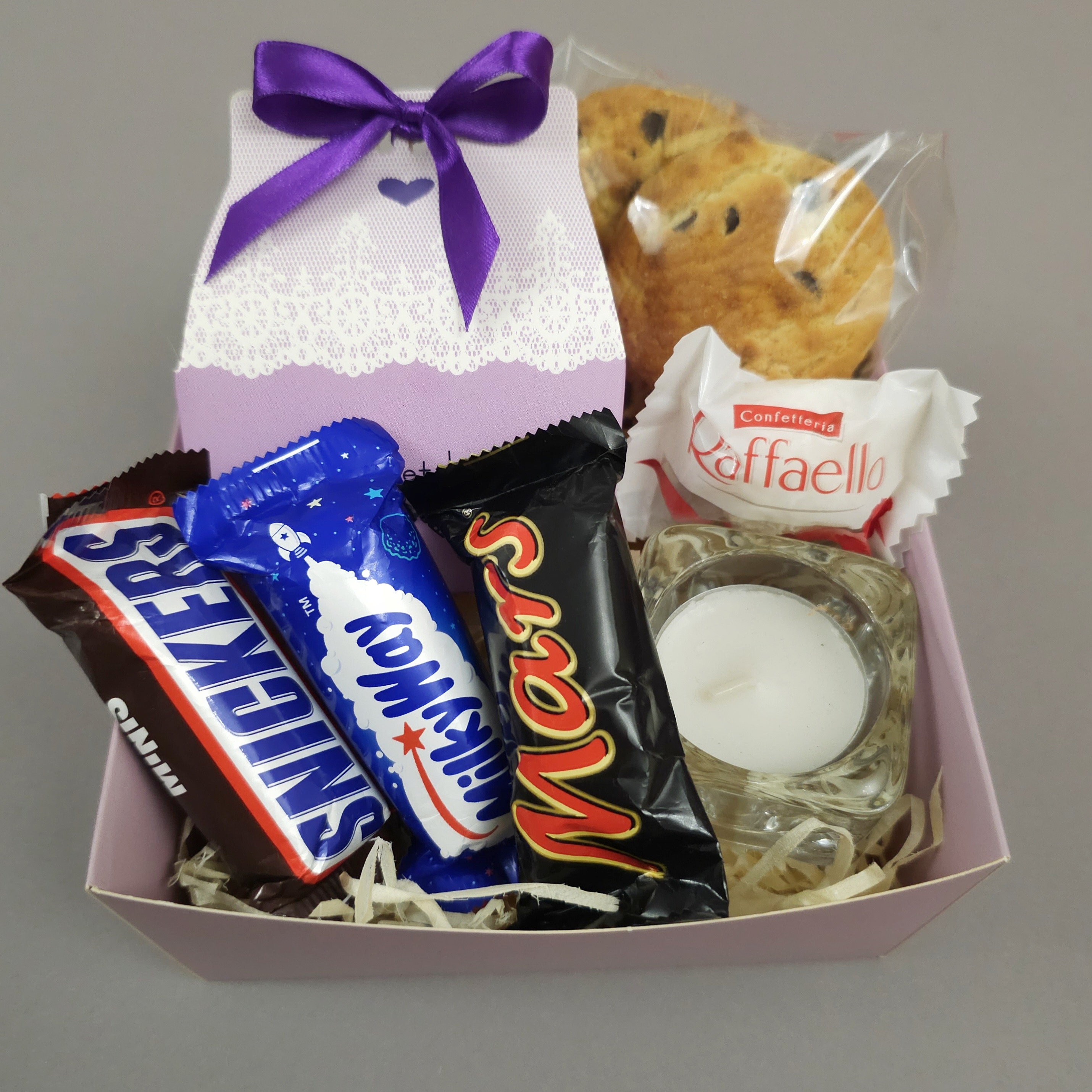 До складу набору входить: - чай з квітами та шматочками фруктів / запашна кава - смачнюче печиво з шоколадом - цукерка Raffaello - mini Snickers, Milky Way, Mars - свічка з вишуканим скляним підсвічником
