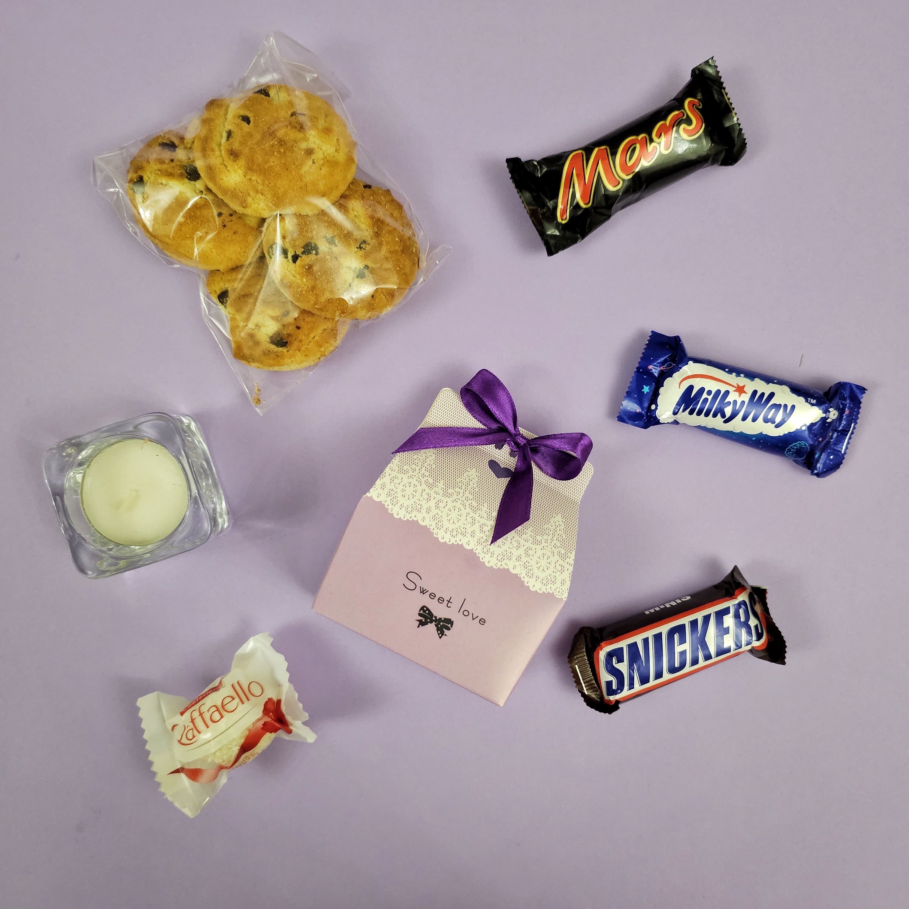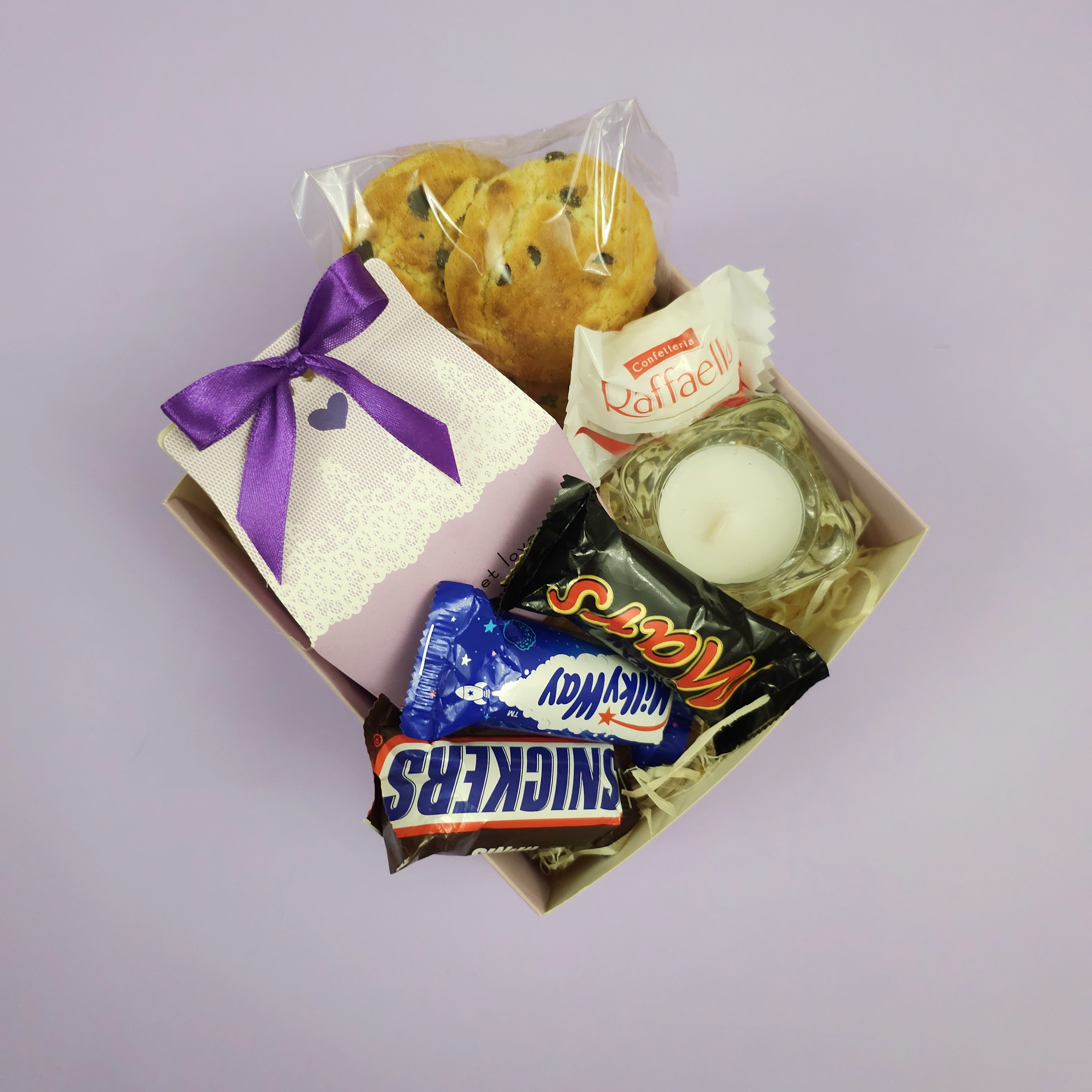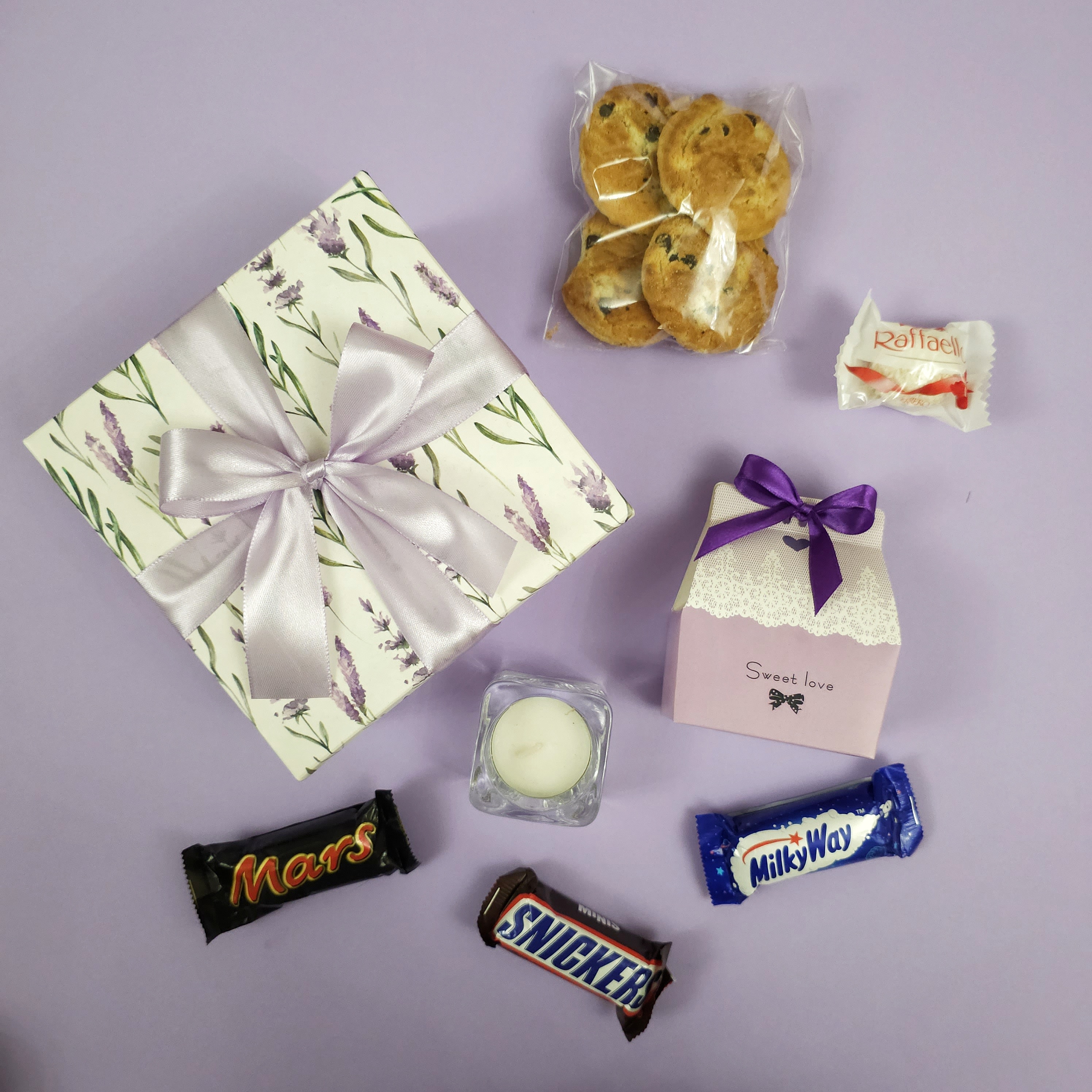 До складу набору входить: - чай з квітами та шматочками фруктів / запашна кава - смачнюче печиво з шоколадом - цукерка Raffaello - mini Snickers, Milky Way, Mars - свічка з вишуканим скляним підсвічником