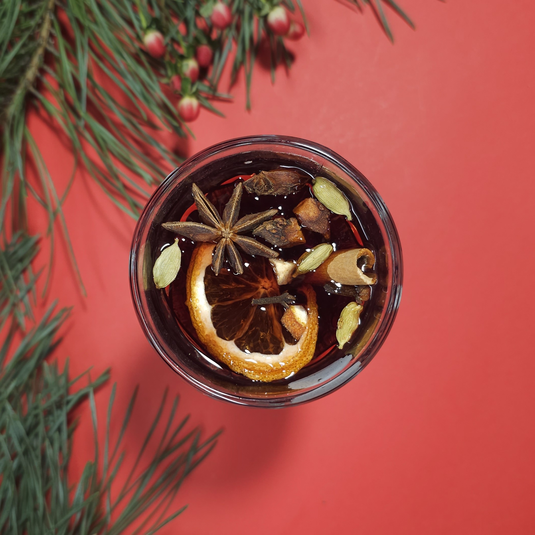 Аромат і декор: - Пакетик духмяних прянощів — палички кориці, сушені апельсини, гвоздика та бадьян для приготування глінтвейну. - Свічка — створює теплу, романтичну атмосферу зимового вечора - Дерев’яна ялинкова прикраса — стильний елемент для святкового декору - Новорічна листівка — щоб додати кілька щирих побажань