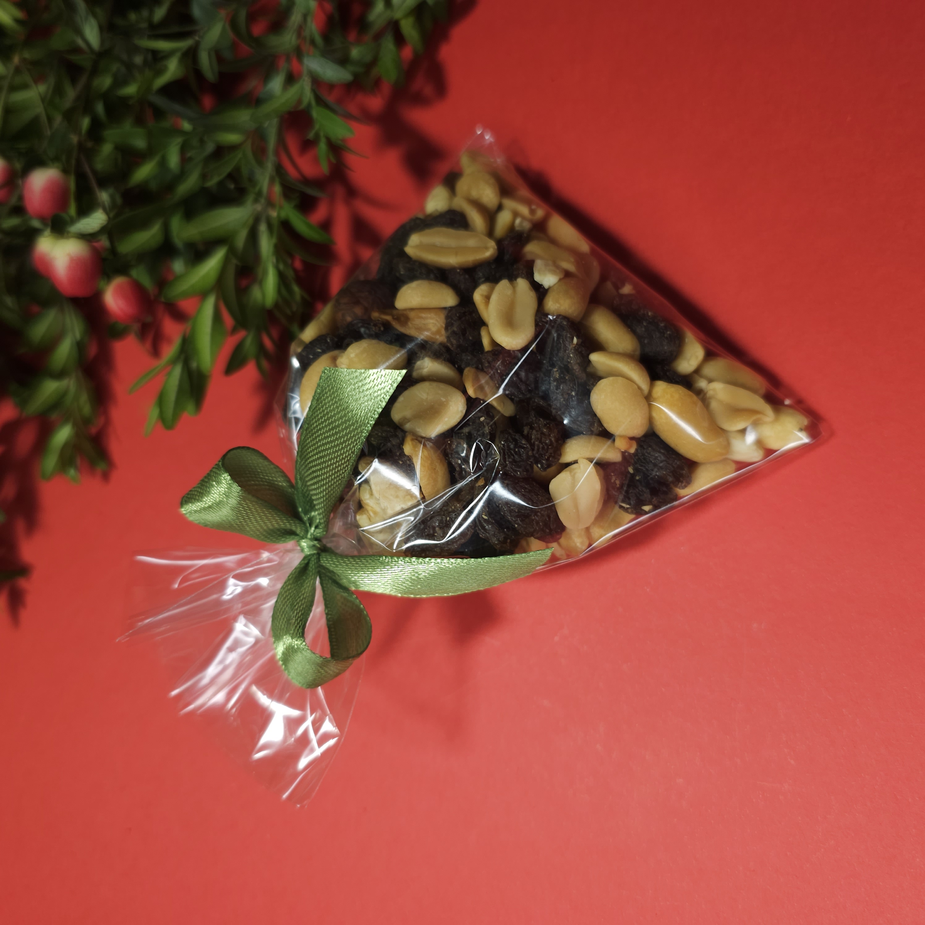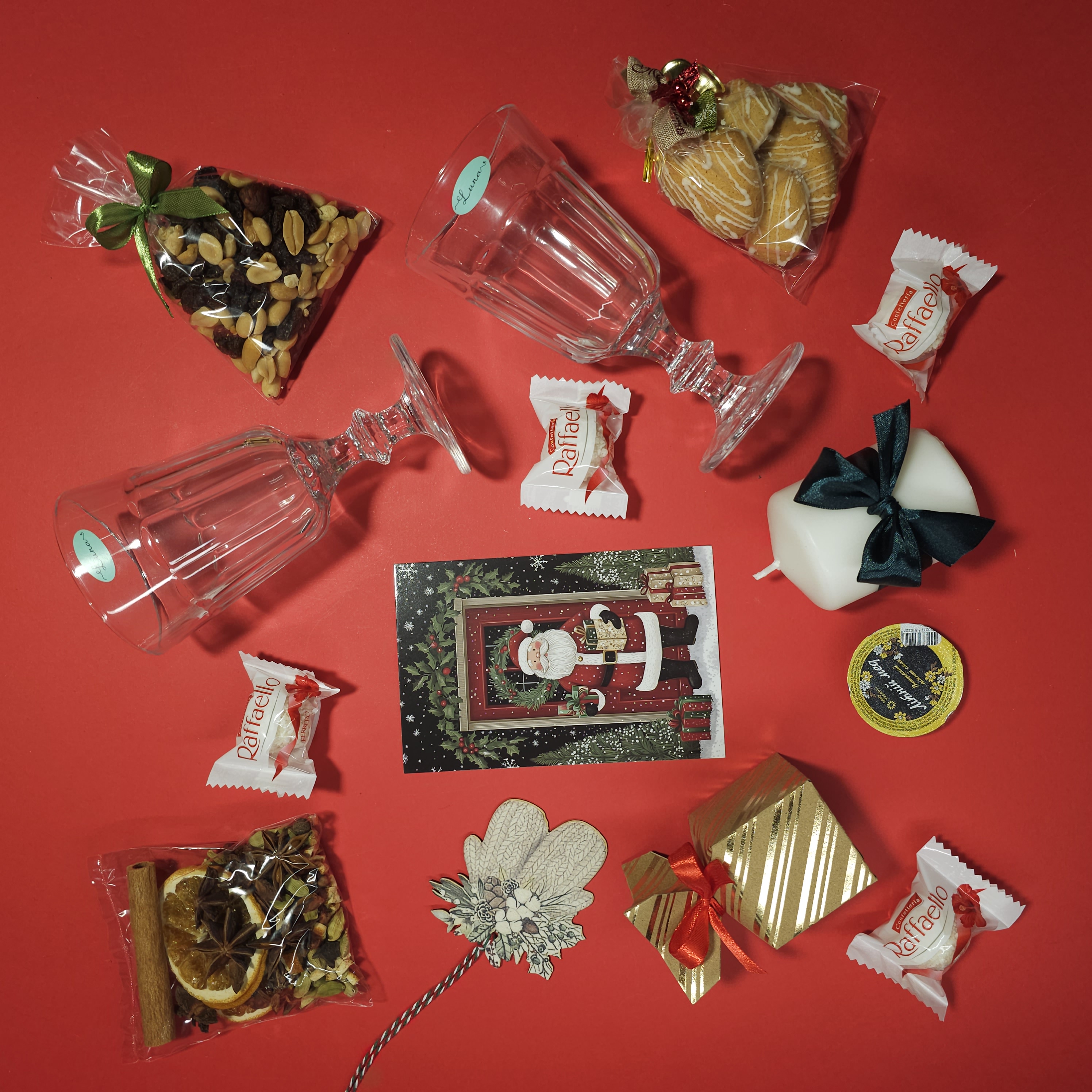 Солодощі: - Цукерки Raffaello — класичні кокосові ласощі з ніжним мигдалем усередині, 3 шт. - Подарункова коробочка з цукеркою всередині — міні-сюрприз для ще більшого задоволення - Пісочне печиво — ароматне, розсипчасте, ідеальне доповнення до глінтвейну - Горіхово-сухофруктова суміш — мікс родзинок, горіхів і сушених ягід для смачного перекусу - Натуральний мед у міні-упаковці — солодкий акцент, що стане в нагоді до глінтвейну