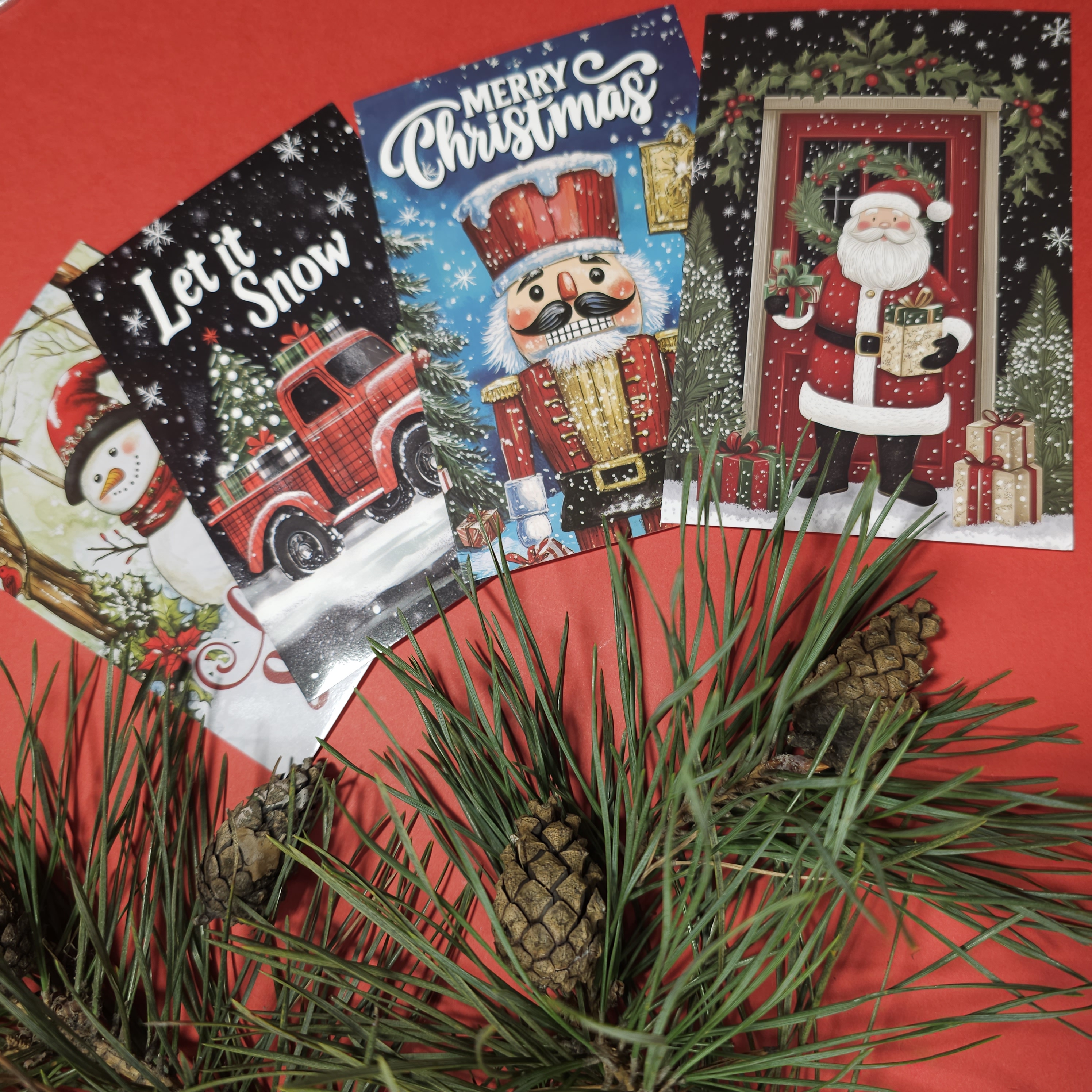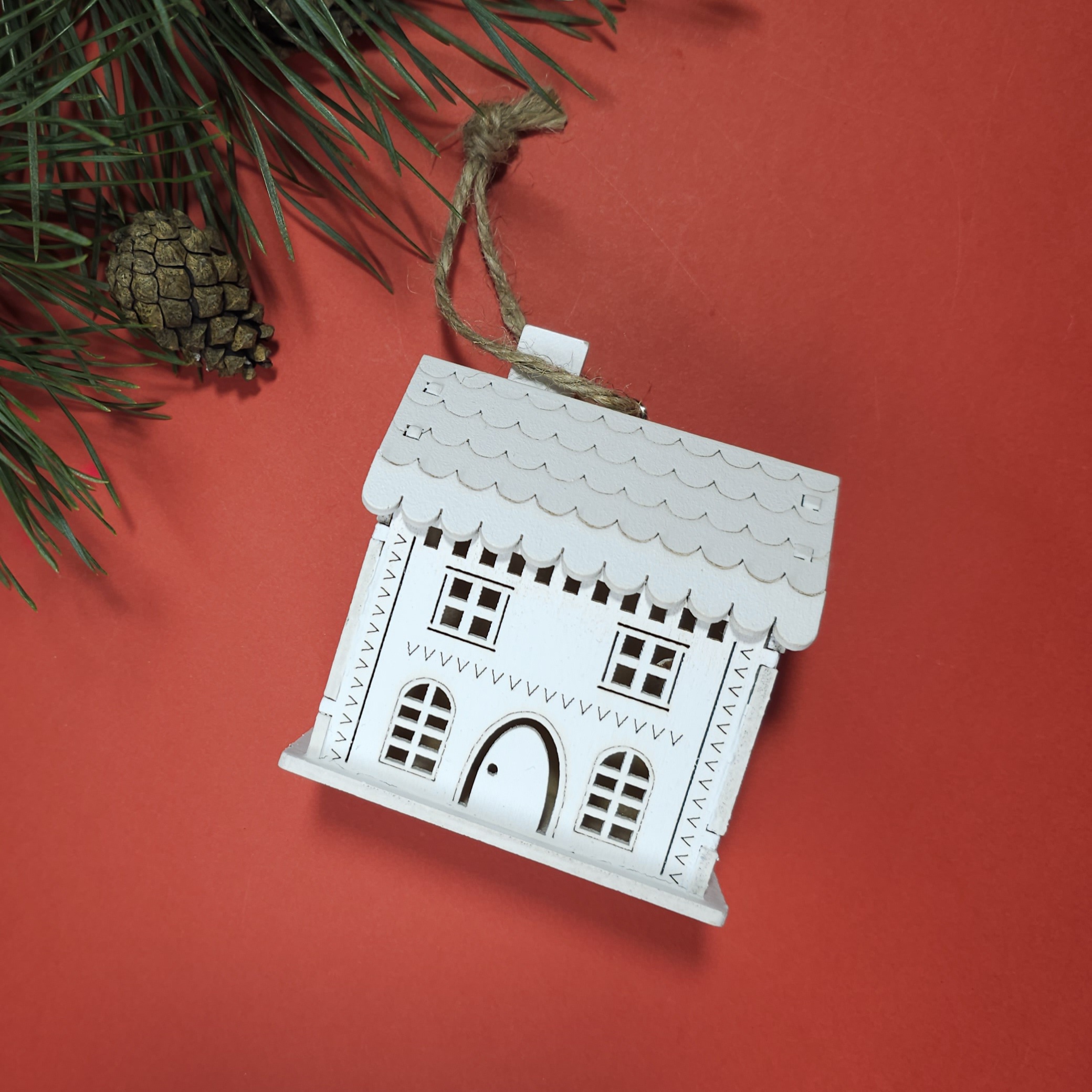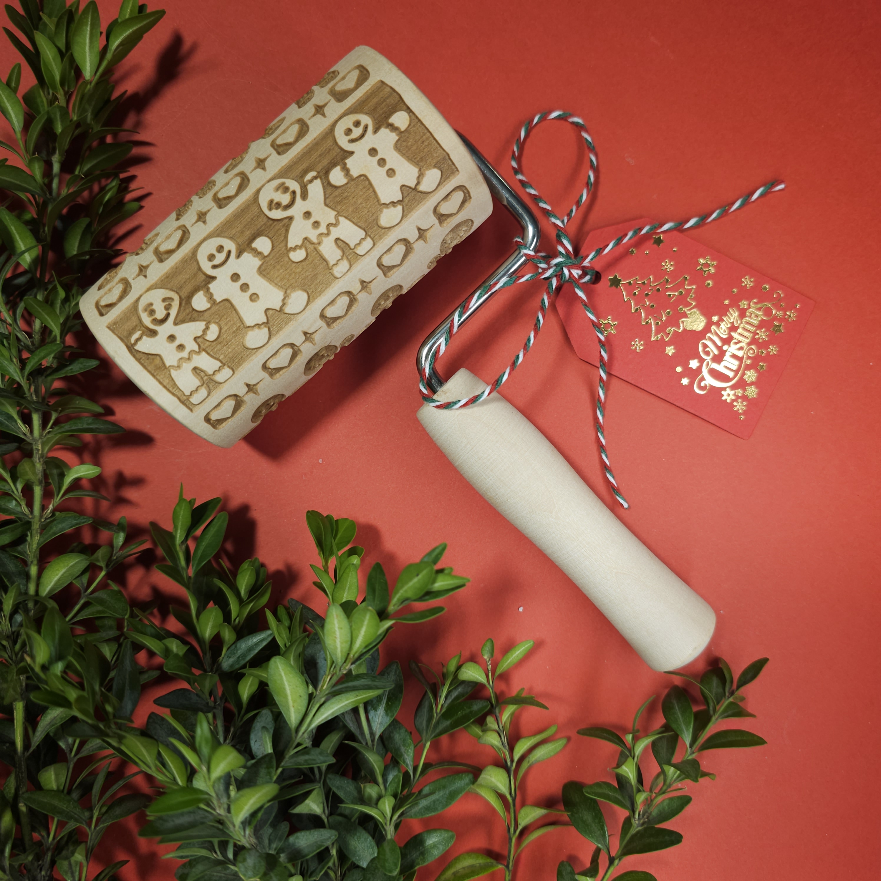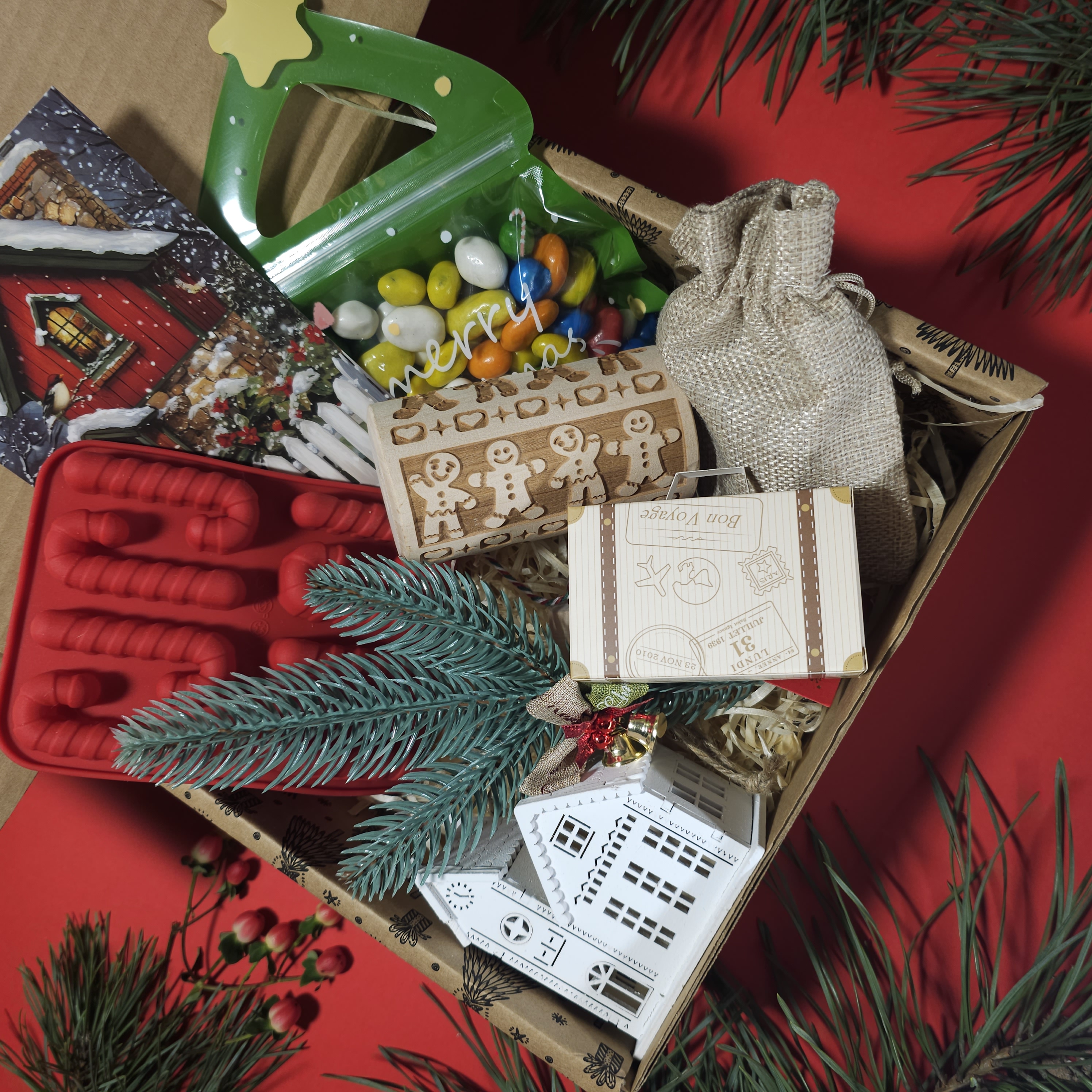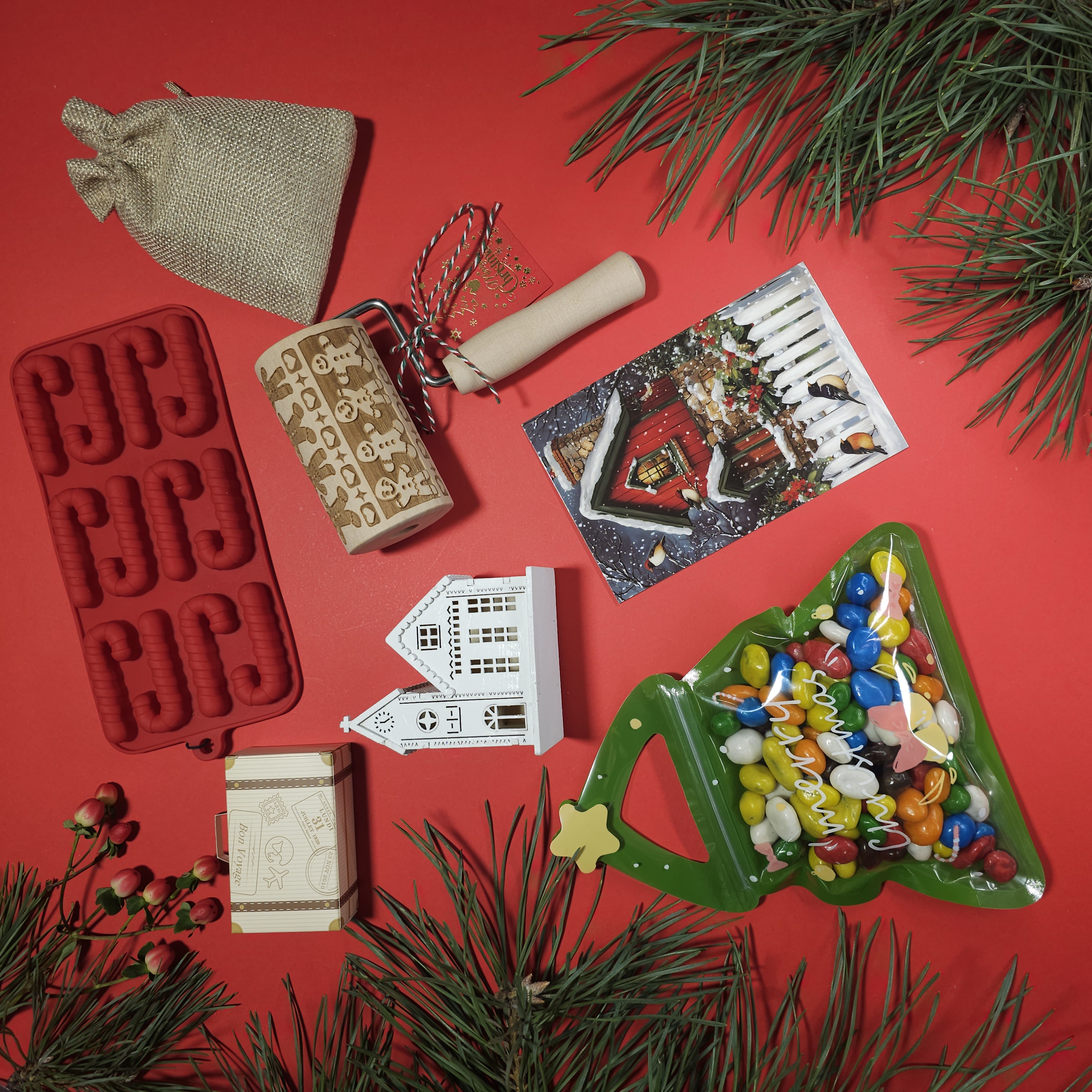 Святкові аксесуари - Форма для шоколаду або льоду (червона, силіконова) — у вигляді різдвяних цукерок. - Дерев’яна качалка-валик з вирізьбленим святковим візерунком “пряничні чоловічки” — для розкатування та декору тіста. - Біла дерев'яна ялинкова прикраса у вигляді будиночка. - Святкова листівка.