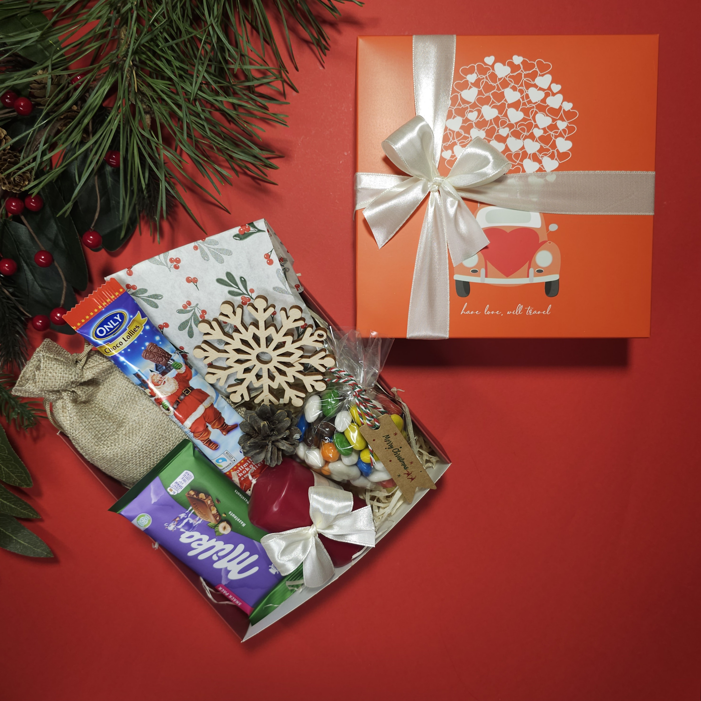 - Шоколад Milka (snack pack) — класичний молочний шоколад із ніжним смаком, що тане у роті - Різнокольорове шоколадне драже — яскравий, святковий акцент для любителів солодкого - Цукерка Only Choco Sticks із Сантою — молочний шоколад у різдвяному оформленні, символ тепла й радості - Запашна кава — зігріваючий напій, що дарує атмосферу свята і затишок