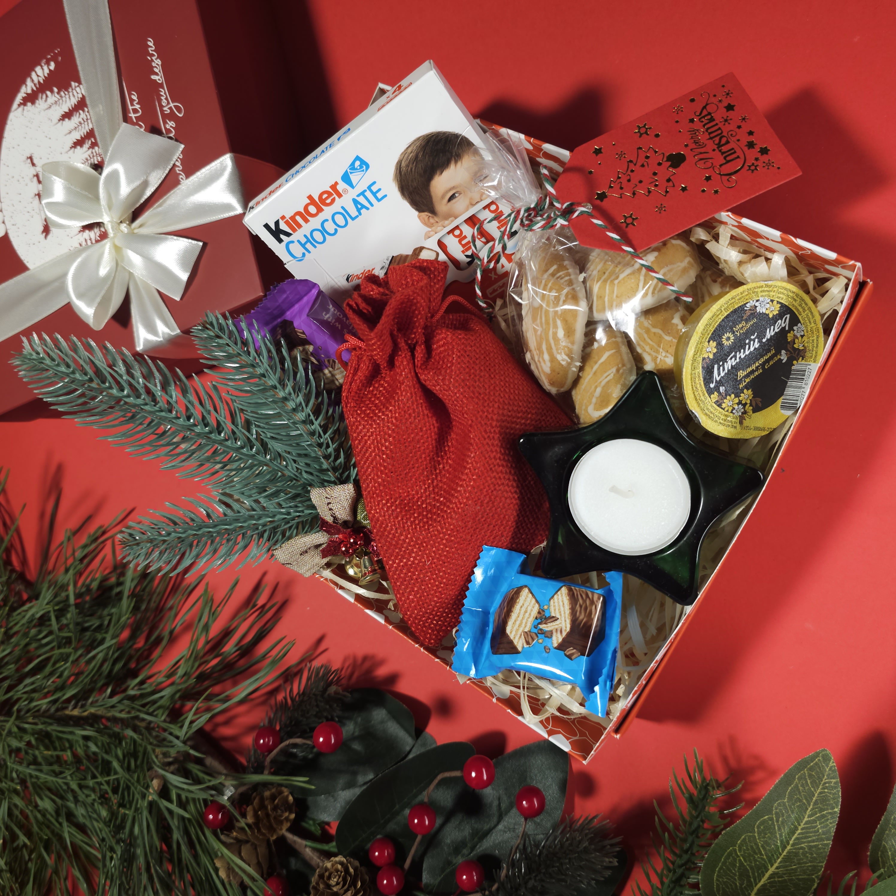 Цей набір створений, щоб подарувати тепло, усмішку й відчуття справжнього свята. У ньому поєднані улюблені солодощі Kinder, натуральний мед, ароматний чай і святковий декор, що створюють домашній комфорт навіть у найпрохолодніші зимові дні. Ідеальний варіант для подарунка колегам, друзям, близьким чи всій родині.