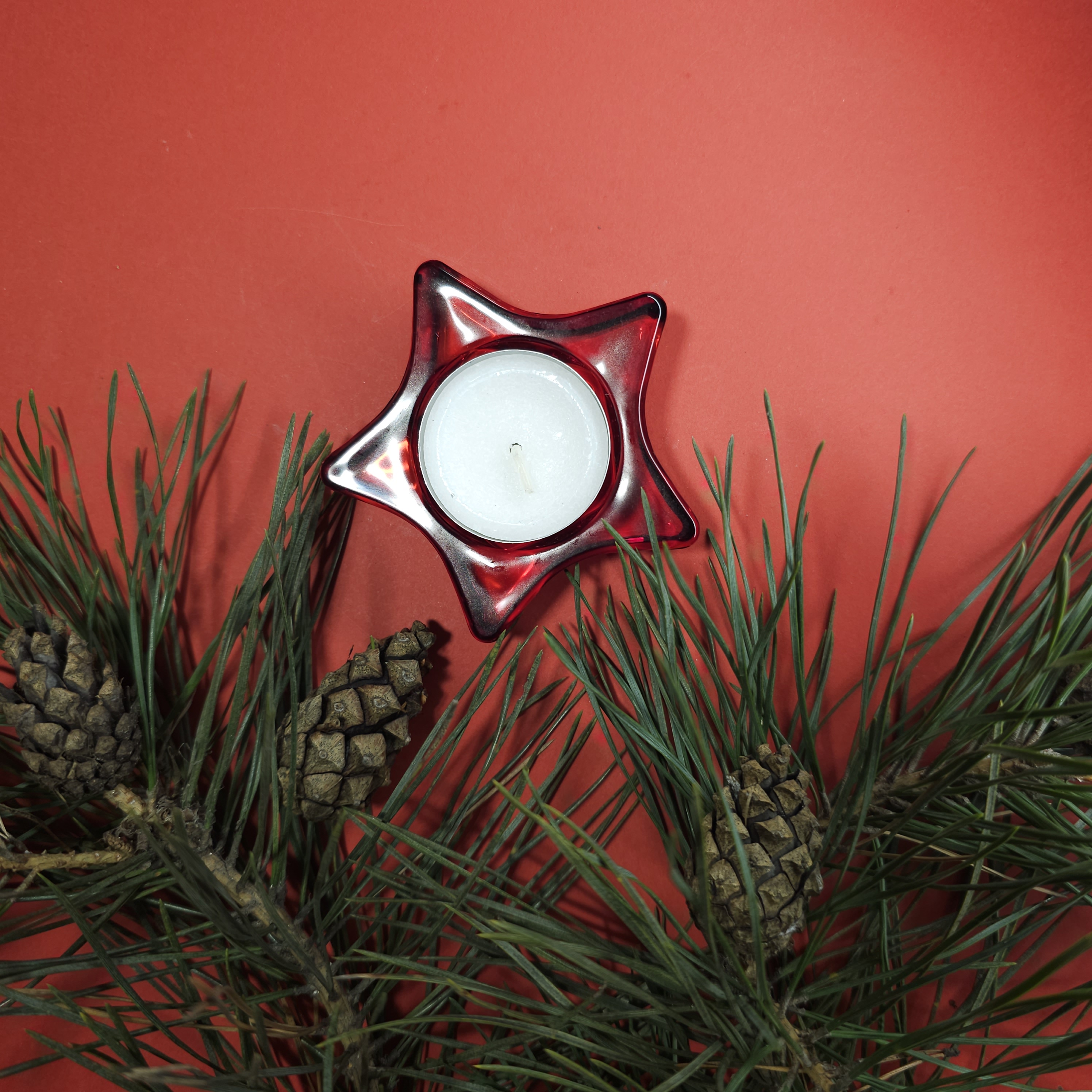 Святкові аксесуари: - Скляний підсвічник у формі зірки з маленькою свічкою — створює теплу, чарівну атмосферу - Дерев’яна ялинкова прикраса — маленький штрих, який додає дому різдвяного настрою