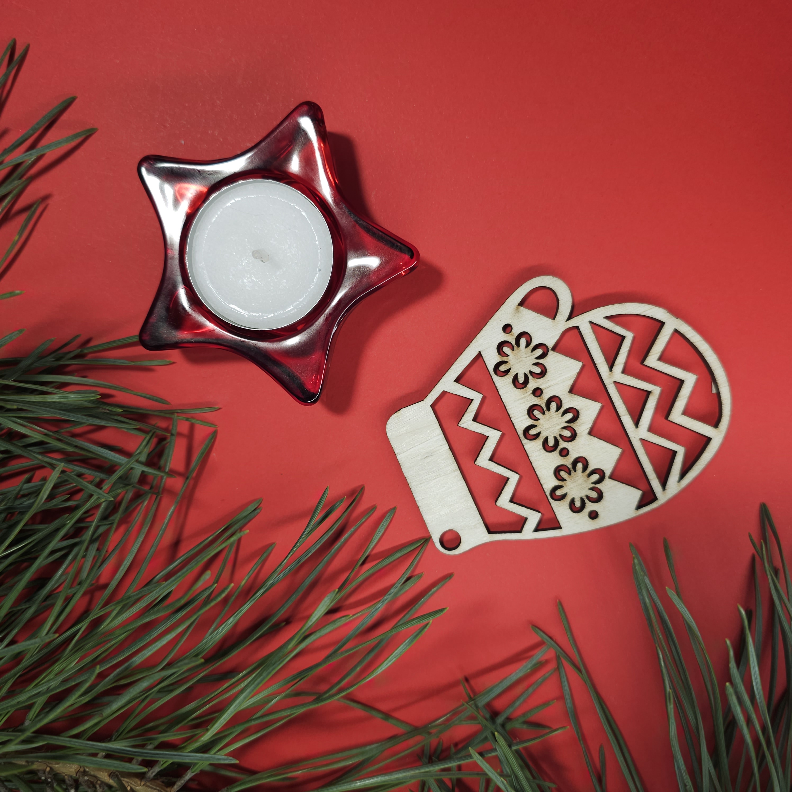 Святкові аксесуари: - Скляний підсвічник у формі зірки з маленькою свічкою — створює м’яке світло та затишну атмосферу - Дерев’яна ялинкова прикраса — стильний акцент для святкового декору