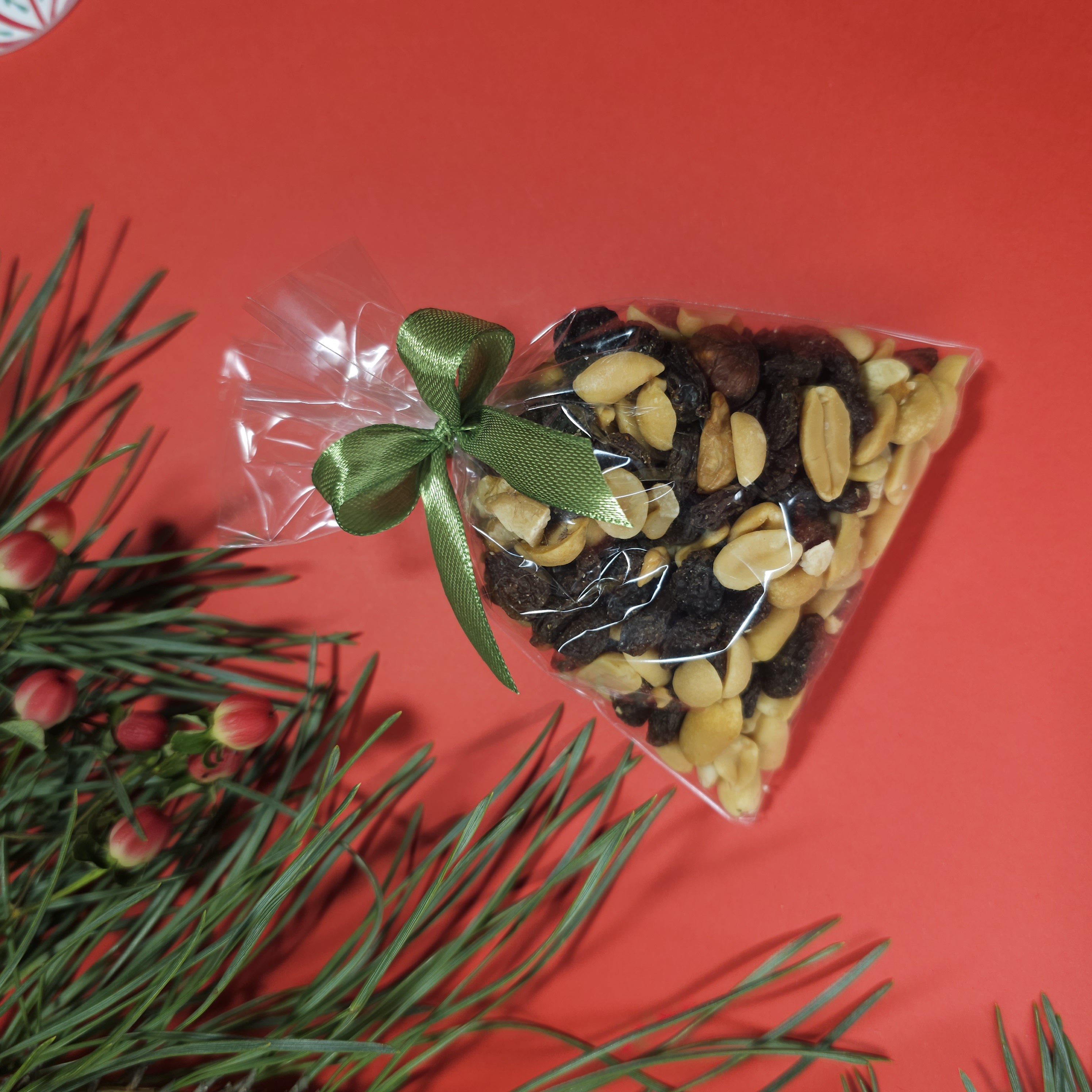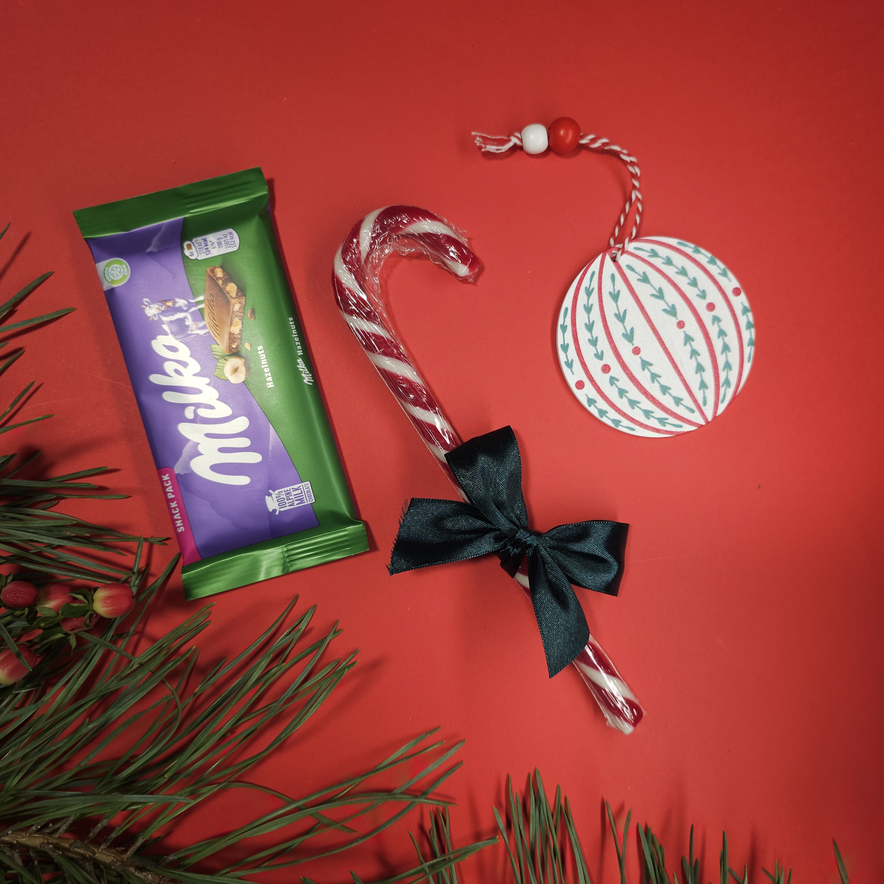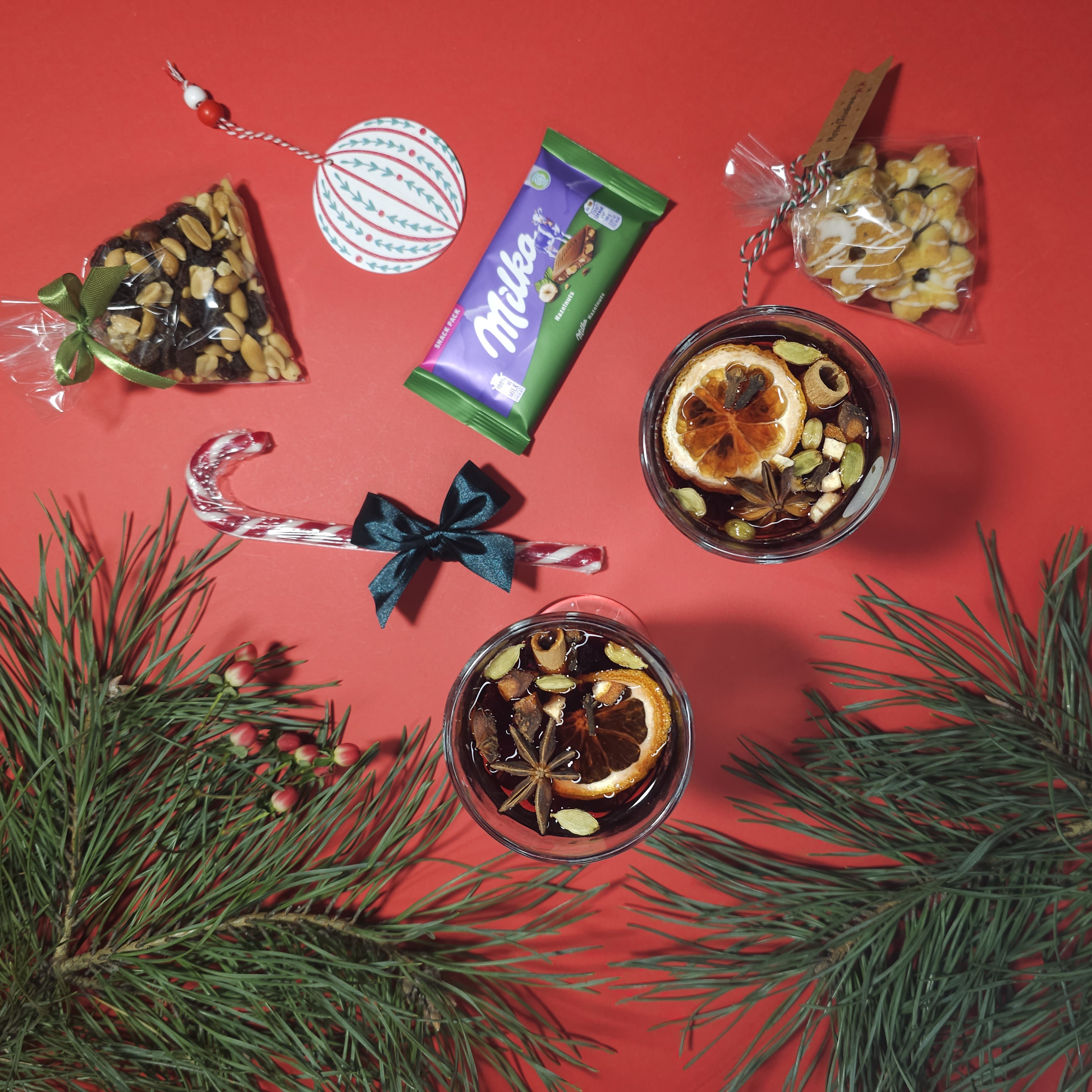 Солодощі: - Пісочне печиво — розсипчасте, ароматне, ідеально смакує до гарячого напою - Фруктово-горіхова суміш — корисна та смачна комбінація горіхів, родзинок і сушених фруктів - Шоколад Milka (snack pack) — ніжний молочний шоколад із фірмовим смаком - Цукрова тростина з карамелі — святковий льодяник, символ Різдва - Натуральний мед — солодкий акцент, що добре смакує з глінтвейном