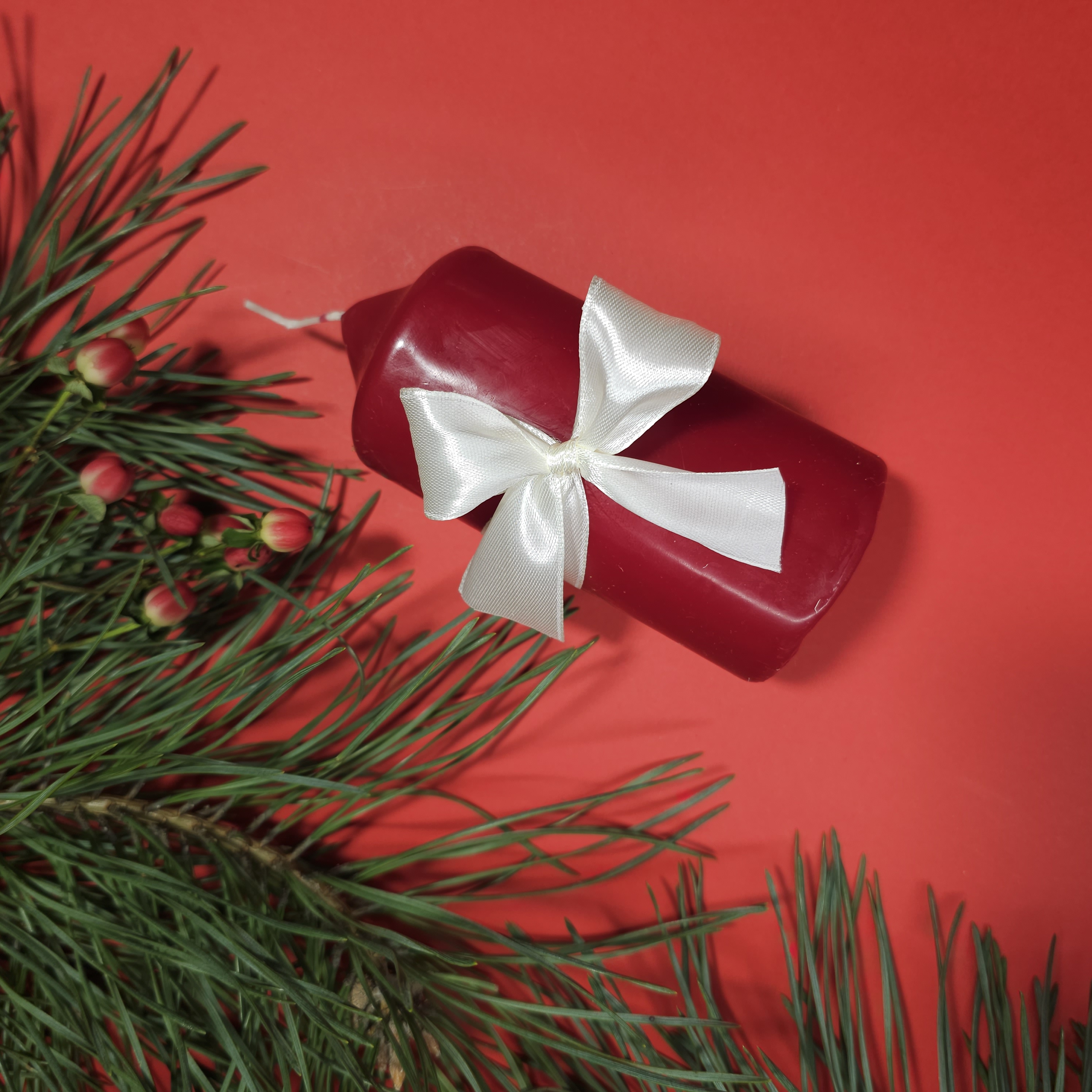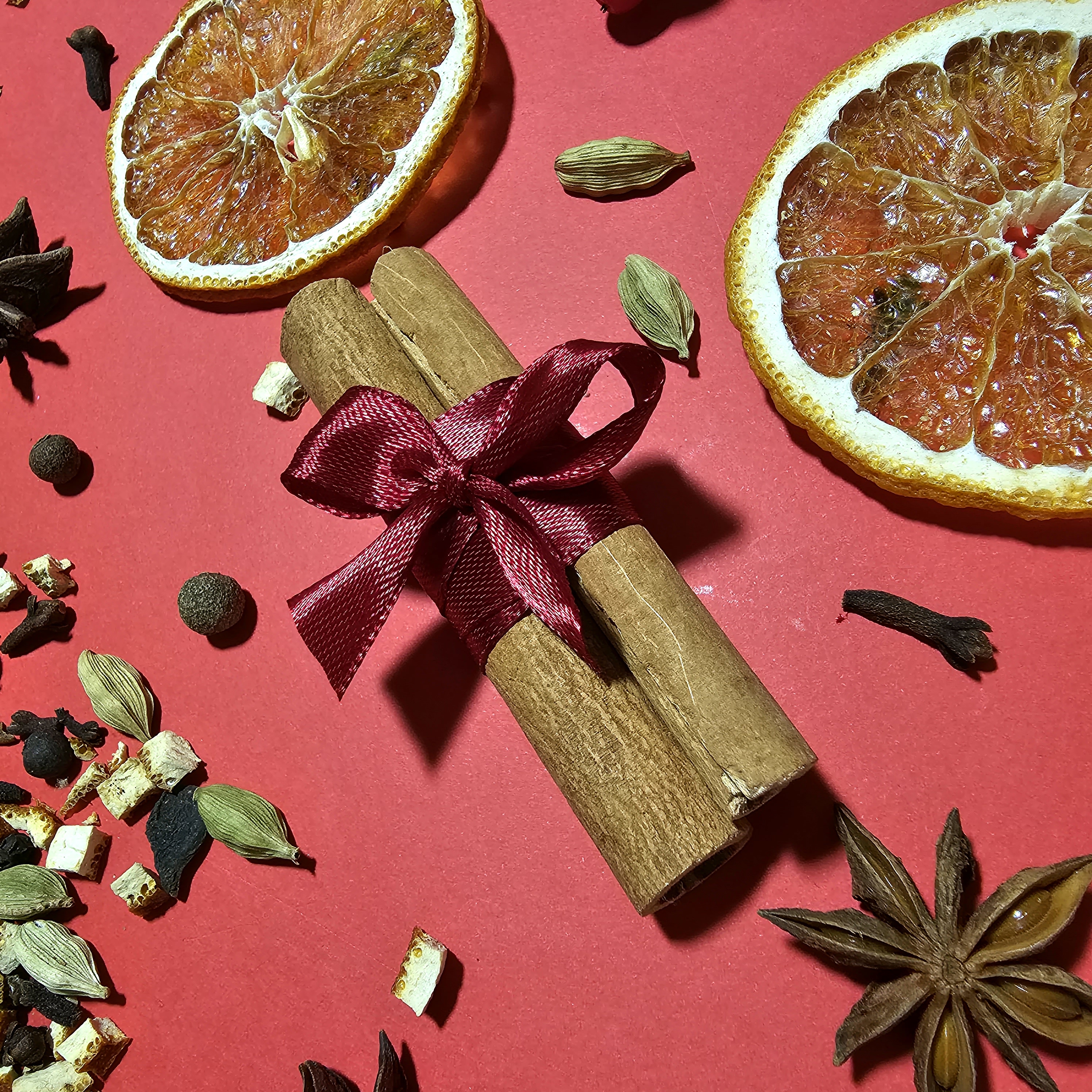 Аромат і декор: - Спеції до глінтвейну — палички кориці, гвоздика, бадьян і сушені фрукти, що додають святкового аромату - Свічка — створює атмосферу спокою, тепла та затишку - Дерев’яна ялинкова прикраса — стильний елемент для святкового декору