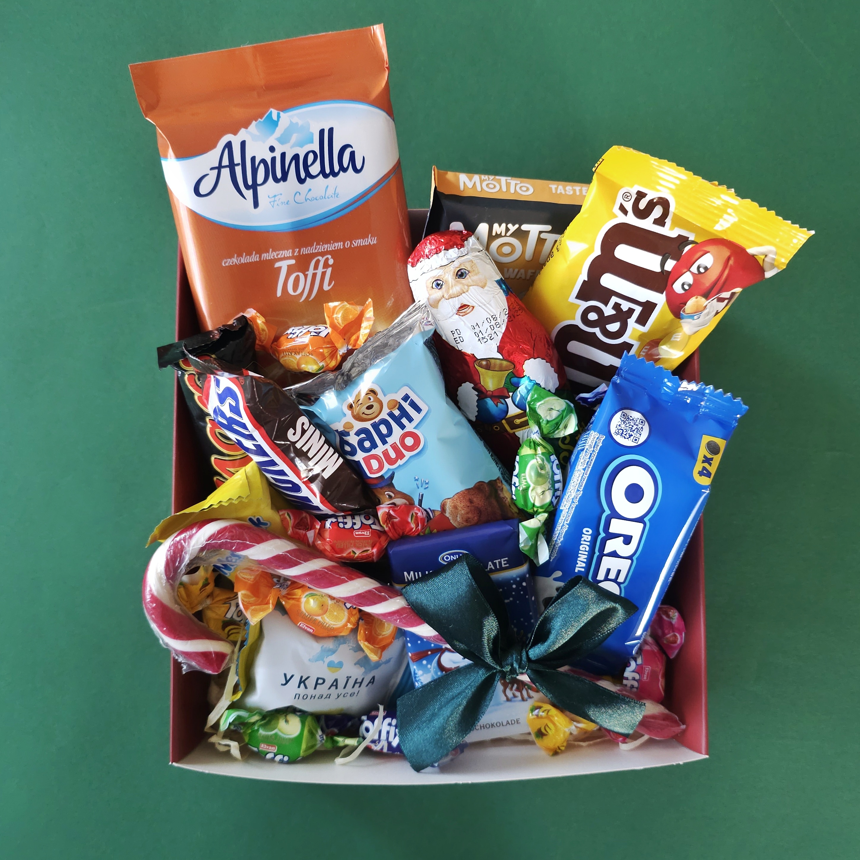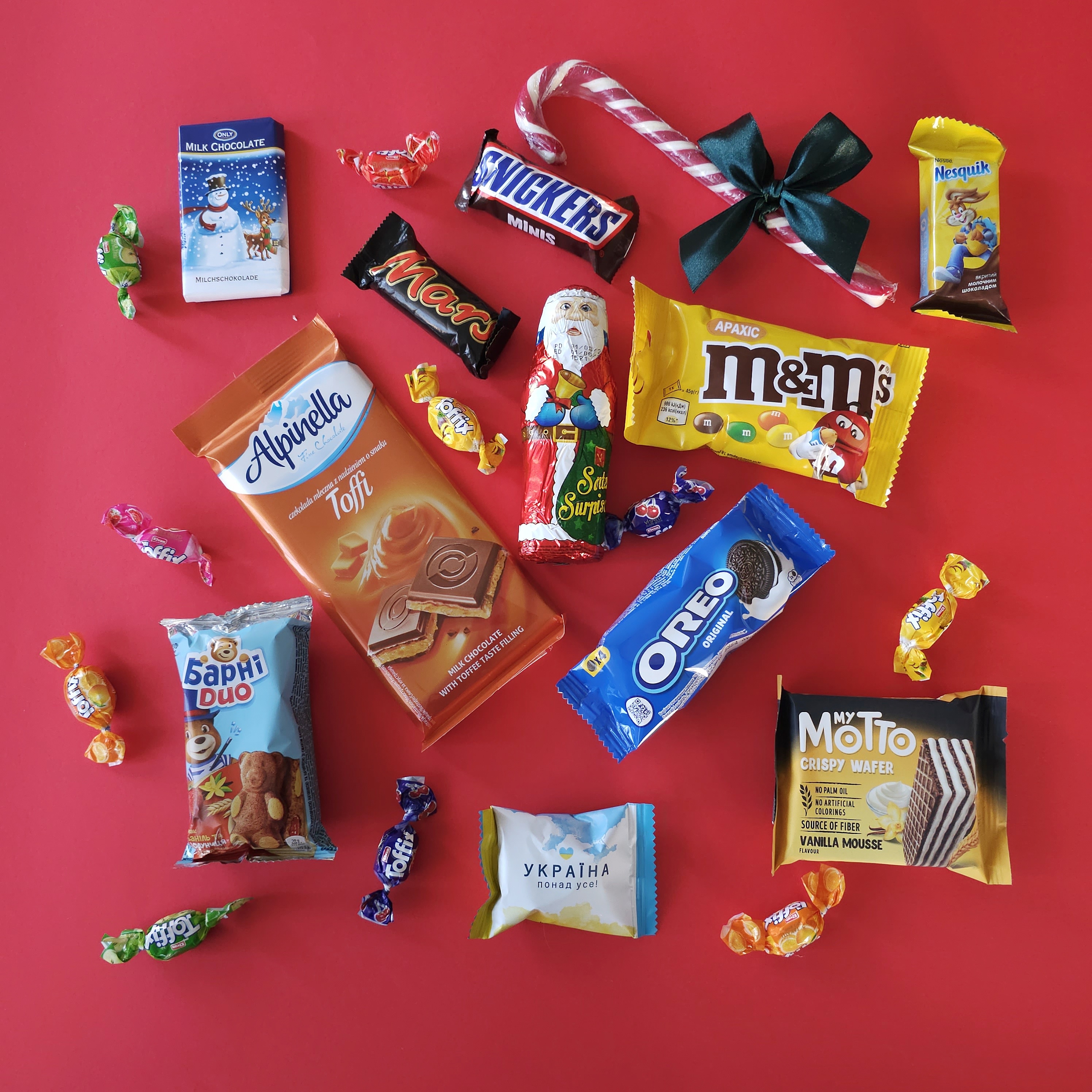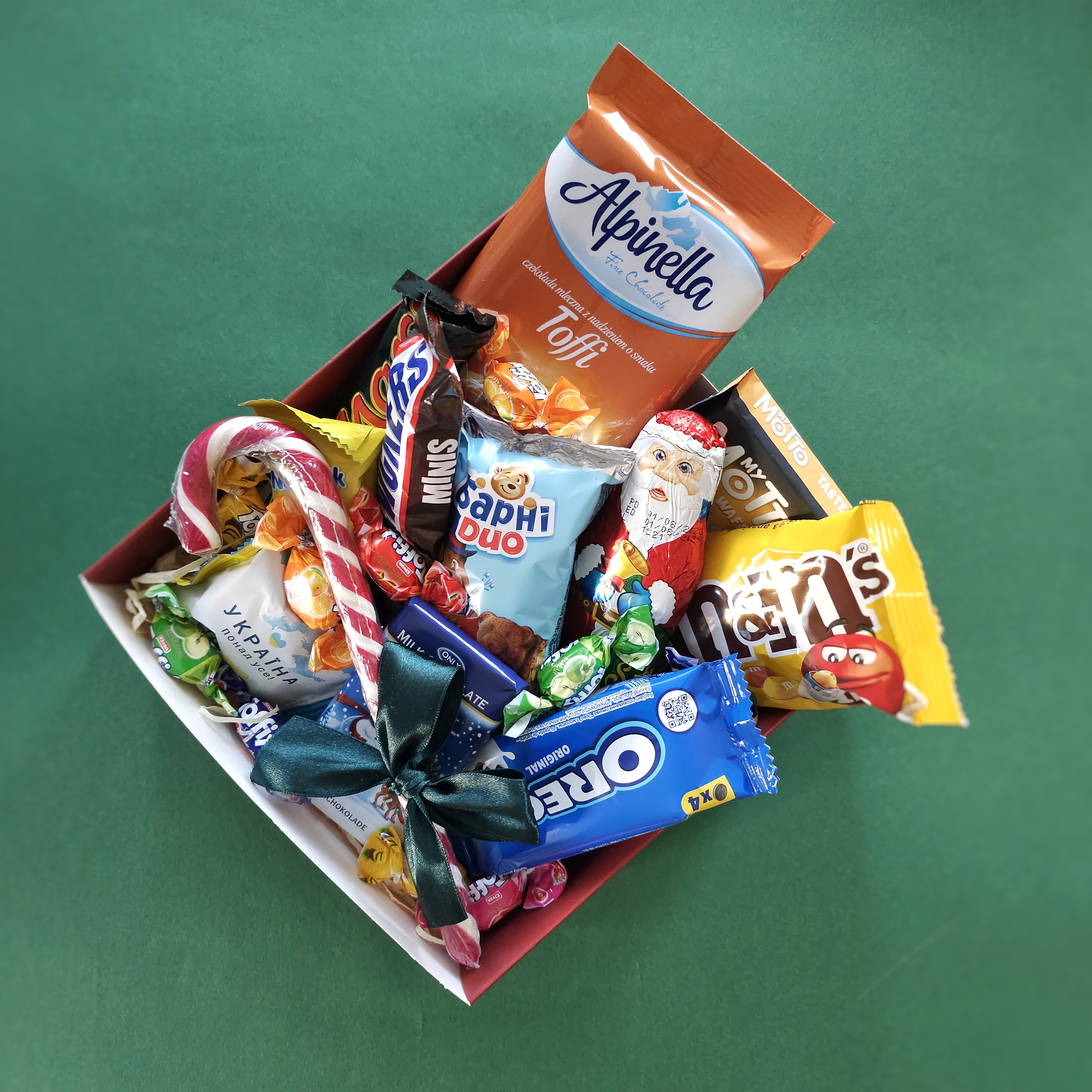 До складу набору входять наступні смаколики (22 одиниці): Молочний шоколад "Alpinella" — ніжний та смачний молочний шоколад, що дарує відчуття свята в кожному кусочку. "M&Ms" (арахіс в шоколаді) — популярні цукерки з хрустким арахісом всередині, покриті смачним молочним шоколадом. Печиво "Oreo" — класичне печиво з ніжним кремом, яке не залишить байдужим нікого. Mini-батончики "Snickers", "Mars" і "Nesquik" — улюблені батончики для тих, хто хоче отримати все: від горіхів до карамелі і шоколаду. Бісквіт "Барні" — смачний бісквіт з кремовою начинкою, що ідеально підходить для швидкого перекусу. Міні-шоколадка "Only" з новорічним дизайном — чудова шоколадка в святковій упаковці, яка привнесе атмосферу Нового року. Фігурка Санта з молочного шоколаду — ідеальний новорічний акцент у вигляді милої фігурки Санти, яка додасть особливого настрою. Вафлі "Motto" — хрусткі вафлі з ніжним кремом, які задоволять ваші солодкі бажання. Льодяник — солодке задоволення для любителів класичних цукерок. Цукерки "Toffix" 10 шт. — смачні карамельки, що відмінно доповнять будь-який святковий стіл.
