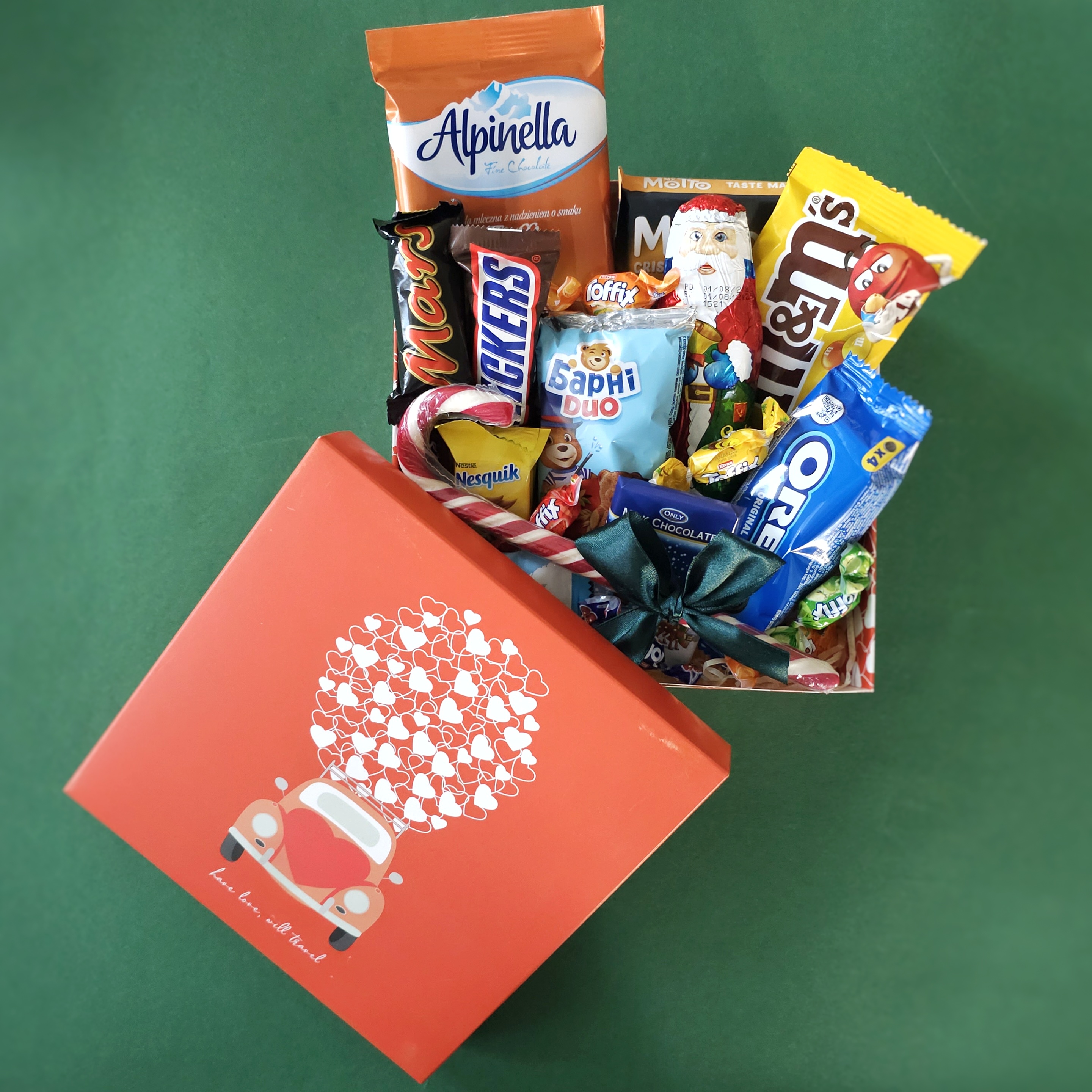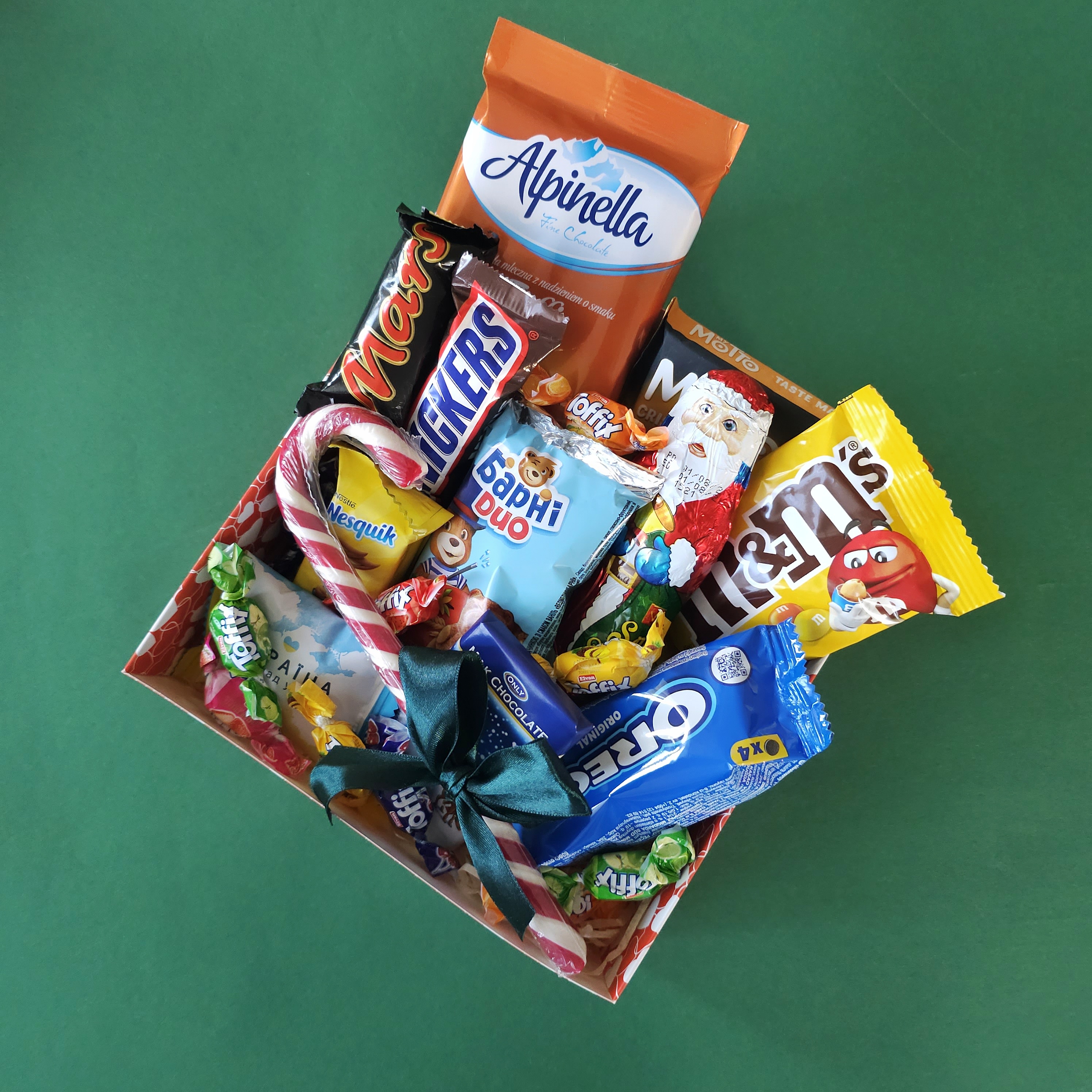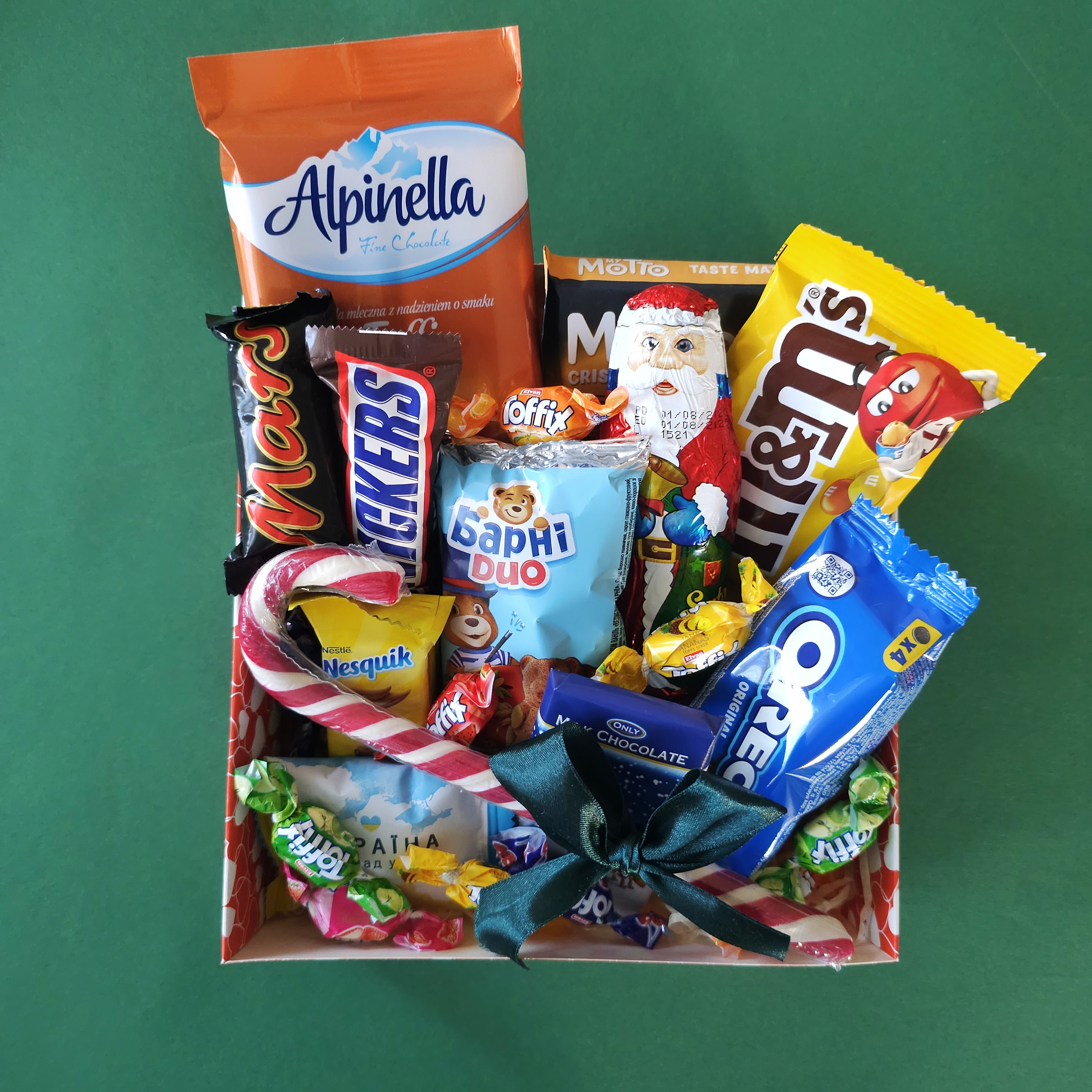 До складу набору входять наступні смаколики (22 одиниці): Молочний шоколад "Alpinella" — ніжний та смачний молочний шоколад, що дарує відчуття свята в кожному кусочку. "M&Ms" (арахіс в шоколаді) — популярні цукерки з хрустким арахісом всередині, покриті смачним молочним шоколадом. Печиво "Oreo" — класичне печиво з ніжним кремом, яке не залишить байдужим нікого. Mini-батончики "Snickers", "Mars" і "Nesquik" — улюблені батончики для тих, хто хоче отримати все: від горіхів до карамелі і шоколаду. Бісквіт "Барні" — смачний бісквіт з кремовою начинкою, що ідеально підходить для швидкого перекусу. Міні-шоколадка "Only" з новорічним дизайном — чудова шоколадка в святковій упаковці, яка привнесе атмосферу Нового року. Фігурка Санта з молочного шоколаду — ідеальний новорічний акцент у вигляді милої фігурки Санти, яка додасть особливого настрою. Вафлі "Motto" — хрусткі вафлі з ніжним кремом, які задоволять ваші солодкі бажання. Льодяник — солодке задоволення для любителів класичних цукерок. Цукерки "Toffix" 10 шт. — смачні карамельки, що відмінно доповнять будь-який святковий стіл.