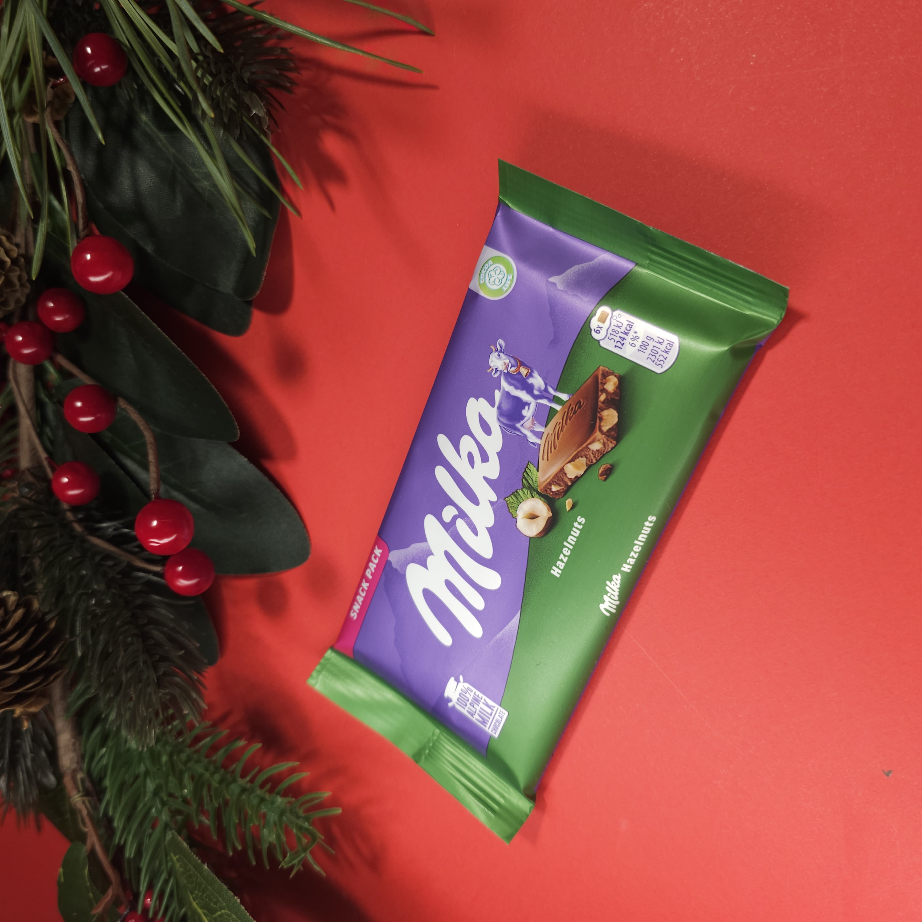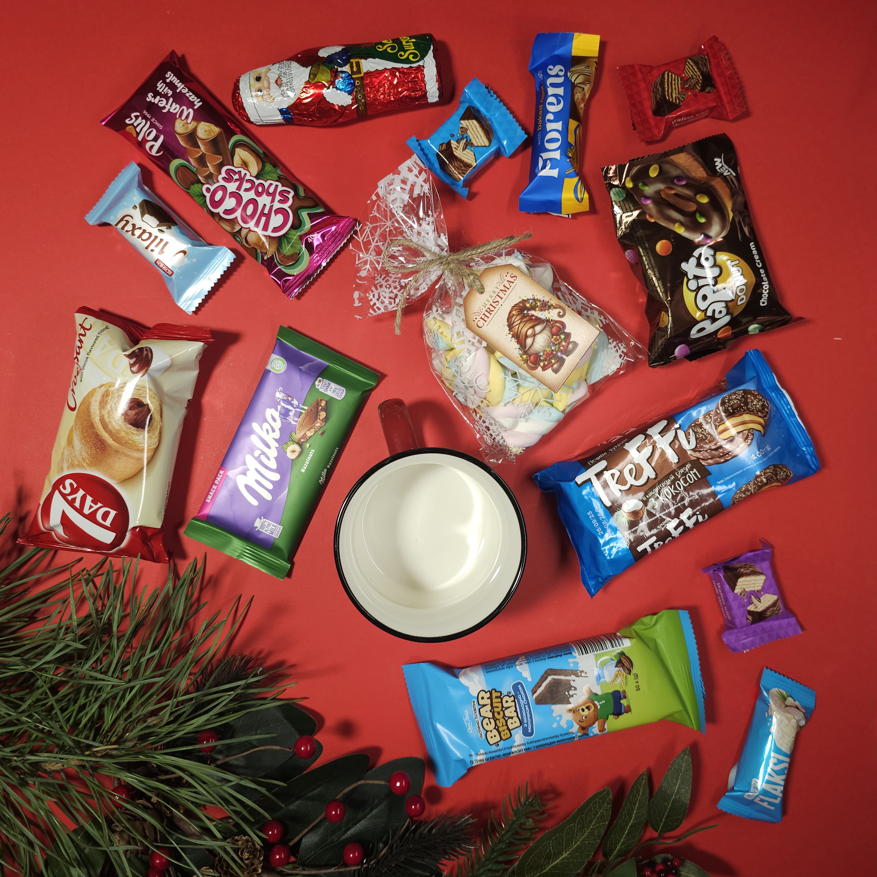 Чашка з святковим принтом – ідеальна для смвкування какао затишними зимовими вечорами. - 7 Days Croissant – круасан із начинкою. - Milka Alpine Milk – плитка смачного молочного шоколаду. - Bear Biscuit Bar – бісквітний батончик у шоколаді. - Trefi Soft Cookie – м’яке шоколадне печиво з начинкою. - PapiTa Choco Cream – ніжний шоколадний донат. - Choco Shocks – вафельний батончик у шоколадній глазурі. - Хрусикі вафлі Johnny Krocker, вкриті глазур'ю, 3 шт. - Flaksi – вафельні цукерки з пластівцями та кокосом, 2 шт. - Florens – шоколадна цукерка з начинкою. - Santa Surprise – шоколадна фігурка у формі Святого Миколая. - Маршмелоу, ідеальне доповнення до какао. - Пташине молоко в шоколадний глазурі.