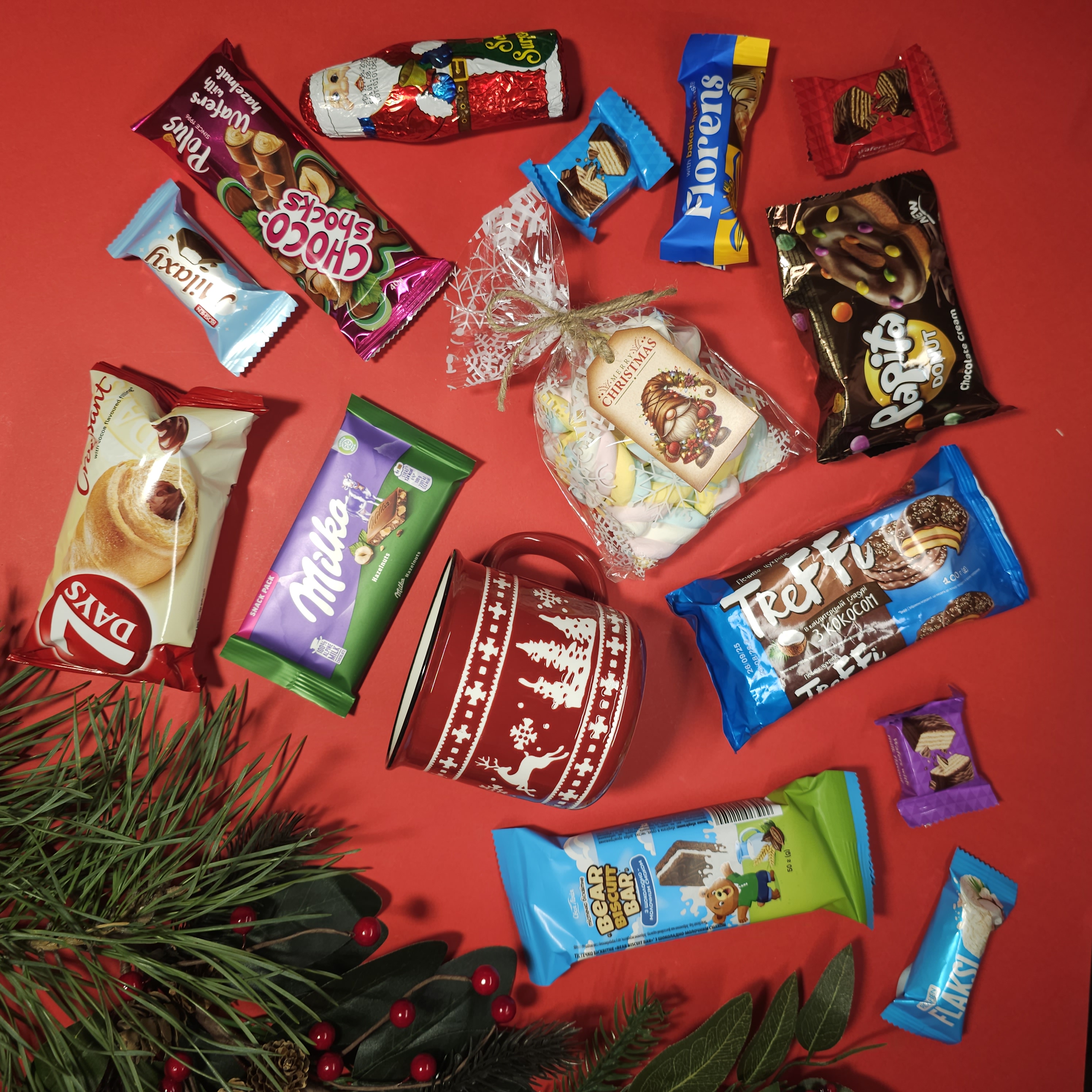 Чашка з святковим принтом – ідеальна для смвкування какао затишними зимовими вечорами. - 7 Days Croissant – круасан із начинкою. - Milka Alpine Milk – плитка смачного молочного шоколаду. - Bear Biscuit Bar – бісквітний батончик у шоколаді. - Trefi Soft Cookie – м’яке шоколадне печиво з начинкою. - PapiTa Choco Cream – ніжний шоколадний донат. - Choco Shocks – вафельний батончик у шоколадній глазурі. - Хрусикі вафлі Johnny Krocker, вкриті глазур'ю, 3 шт. - Flaksi – вафельні цукерки з пластівцями та кокосом, 2 шт. - Florens – шоколадна цукерка з начинкою. - Santa Surprise – шоколадна фігурка у формі Святого Миколая. - Маршмелоу, ідеальне доповнення до какао. - Пташине молоко в шоколадний глазурі.