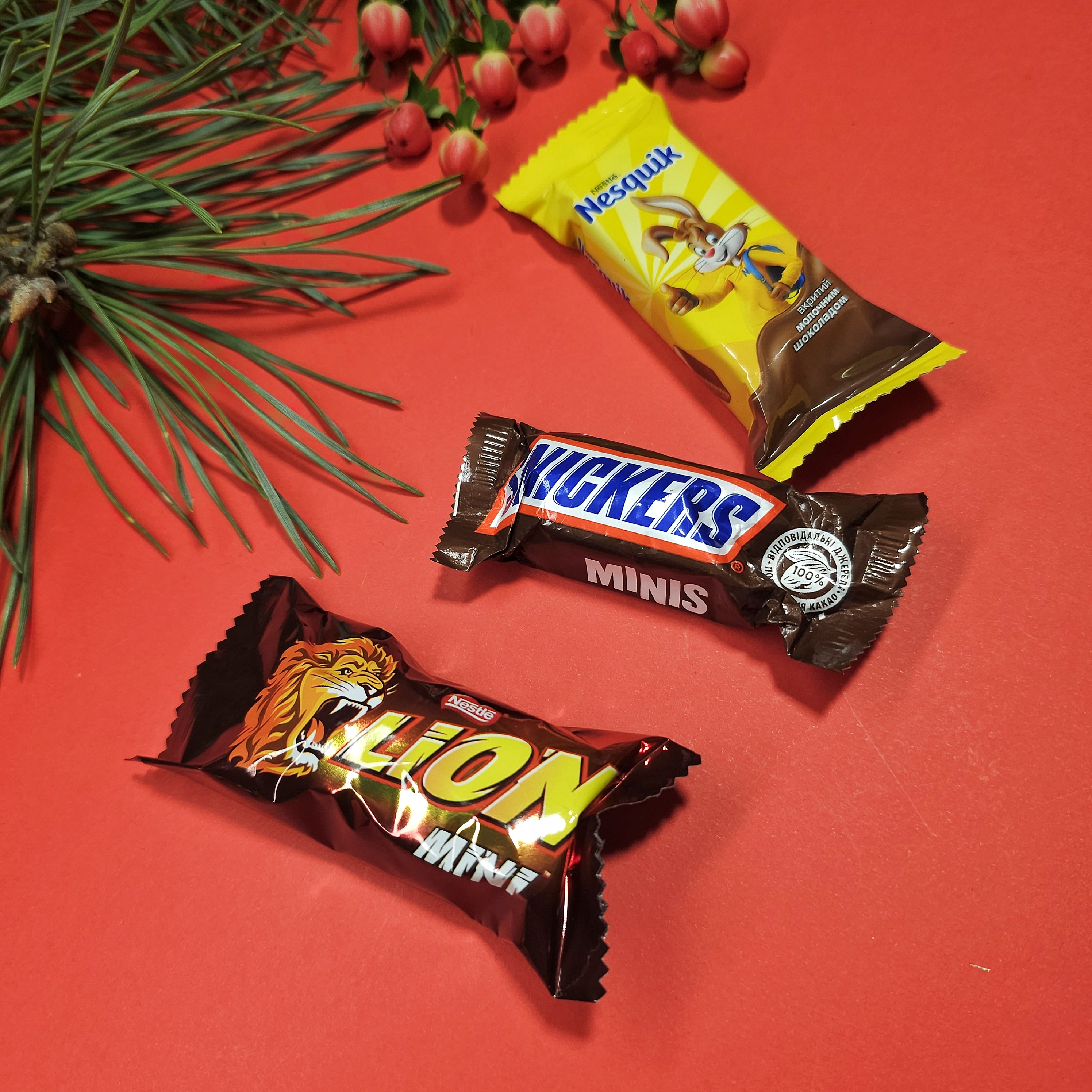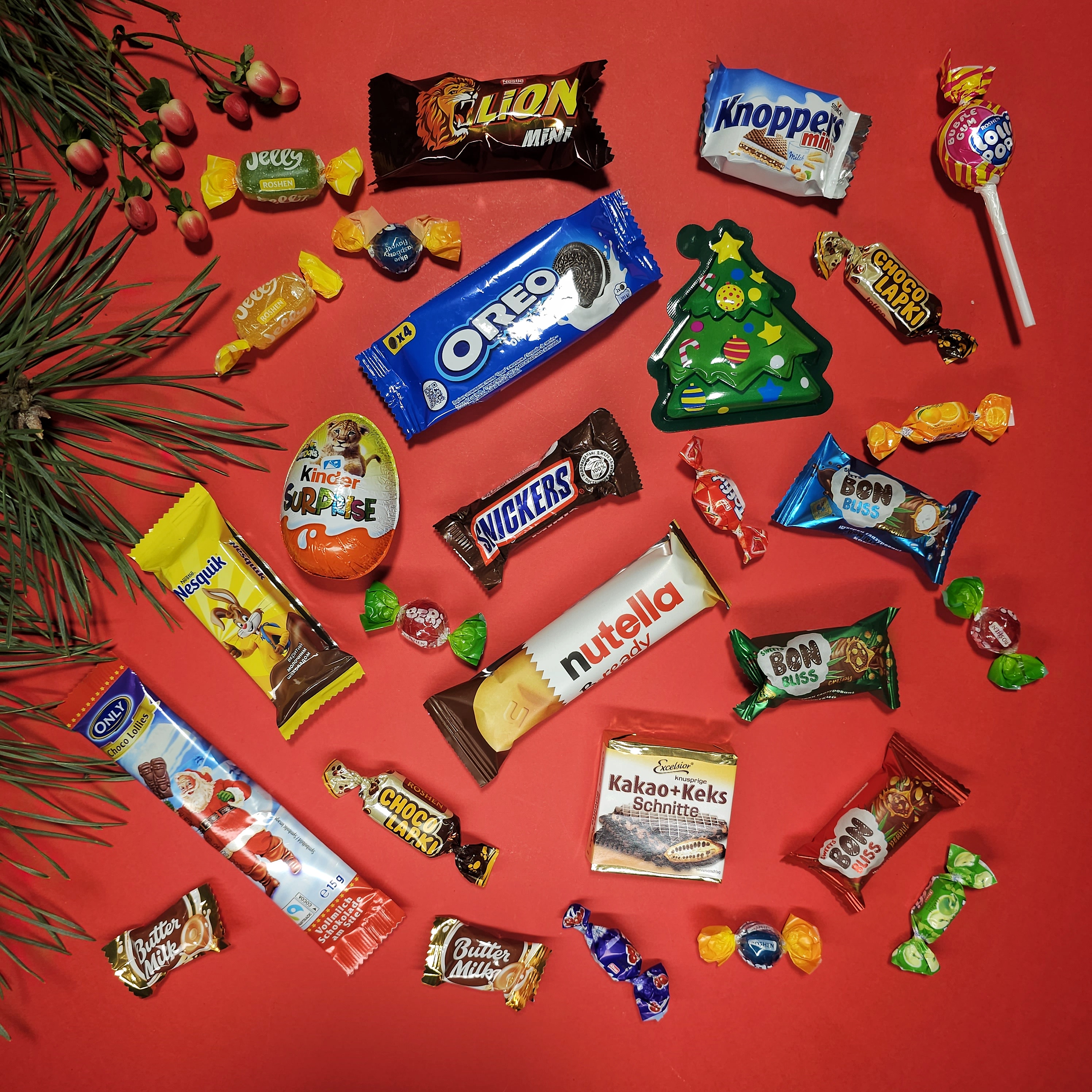 Усередині ви знайдете справжню солодку колекцію: - шоколадне яйце "Kinder Surprise", 1 шт. - вафельний батончик "Nutella B-ready" з горіховою пастою з какао, 1 шт. - печиво "Oreo" 4 печива, 38 г - шоколадний міні-батончик "Snickers", 1шт. - шоколадний міні-батончик "Lion", 1шт. - шоколадний міні-батончик "Nesquik", 1шт. - цукерки глазуровані «Bon Bliss», 3 шт. - цукерки тоффі з подрібненим арахісом у шоколадній глазурі "шоколапки", 2 шт. - шоколад "Only", 15г - вафлі "Excelsior Kakao Keks Schnitte" з какао, 1 шт. - вафлі з горіховим кремом "Knoppers mini", 1 шт. - новорічна цукерка "Обана", 1 шт. - льодяник "Lolli pops", 1 шт. - карамель "Butter-Milk" зі смаком солоної карамелі, 2 шт. - желейні цукерки "Gelly", 2 шт. - жувальні цукерки "TOFFIX", 4 шт. - карамельні цукерки "Beri", 4 шт.
