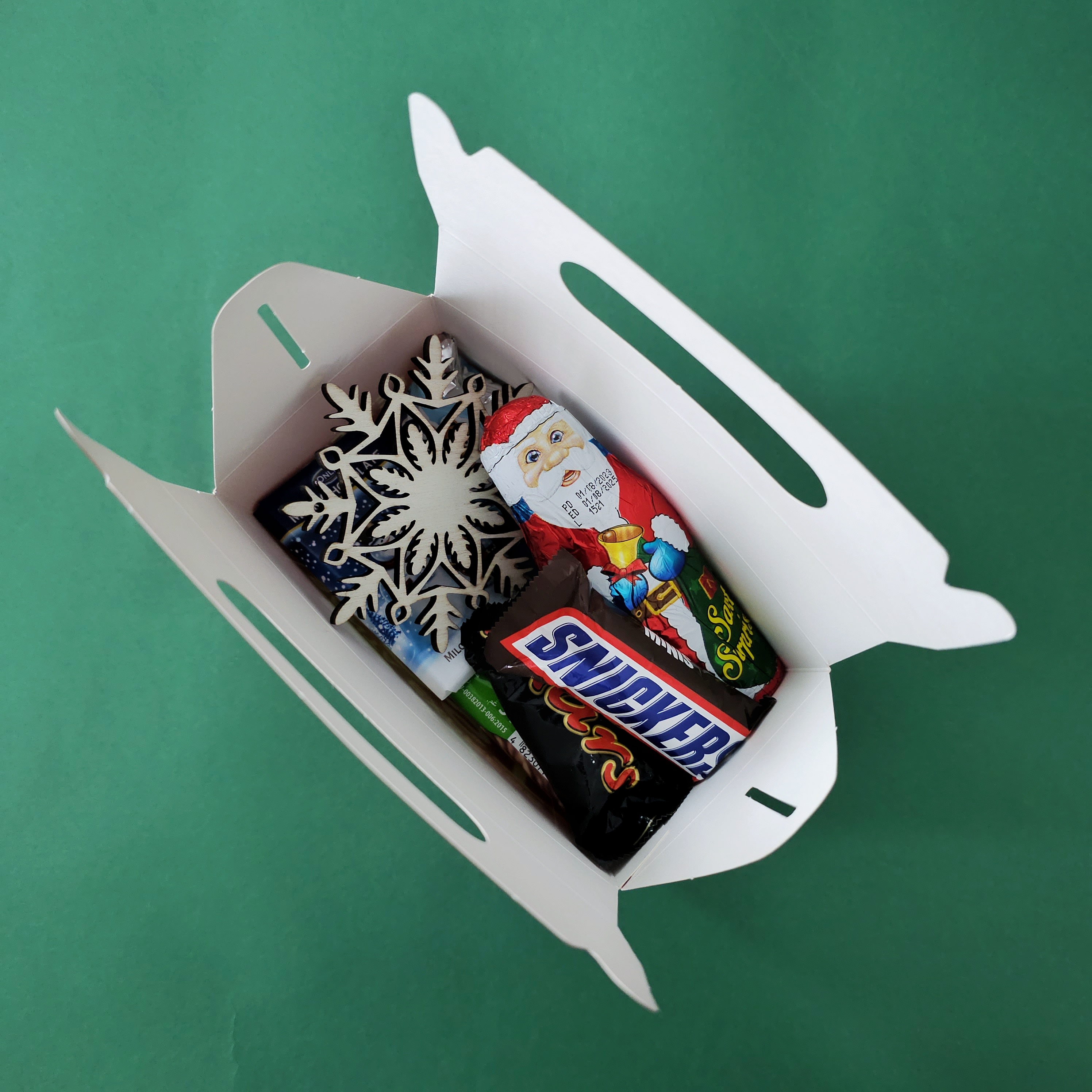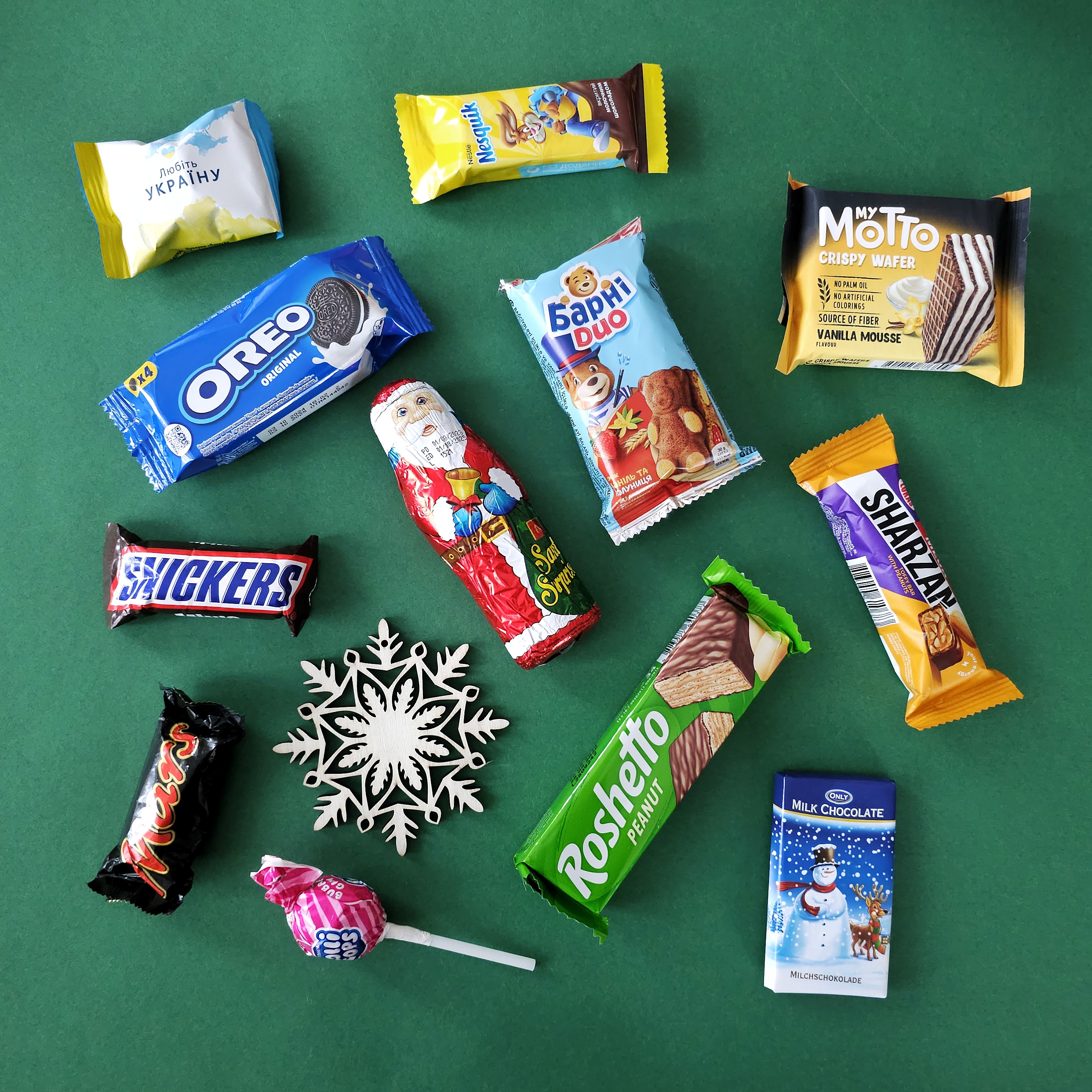 Печиво "Oreo" – хрустке та ніжне, улюблене багатьма. Mini батончики "Snickers", "Mars", "Nesquik" – маленькі порції великого задоволення. Бісквіт "Барні" – легкий та смачний перекус із кремовою начинкою. Молочний шоколад "Only" – ніжність у кожному шматочку. Фігурка Санта з молочного шоколаду – символ Різдва, що створює святковий настрій. Батончик "Sharzan" – для любителів горіхових ласощів. Вафлі Roshetto глазуровані – солодкий хрусткий вибір. Вафлі "Motto" – ідеальний баланс ніжного крему і хрусткої текстури. Карамельний льодяник "Lollipops" – класика для справжніх ласунів. Цукерка – маленький солодкий сюрприз. Дерев'яна іграшка – пам'ятний сувенір для прикраси ялинки.