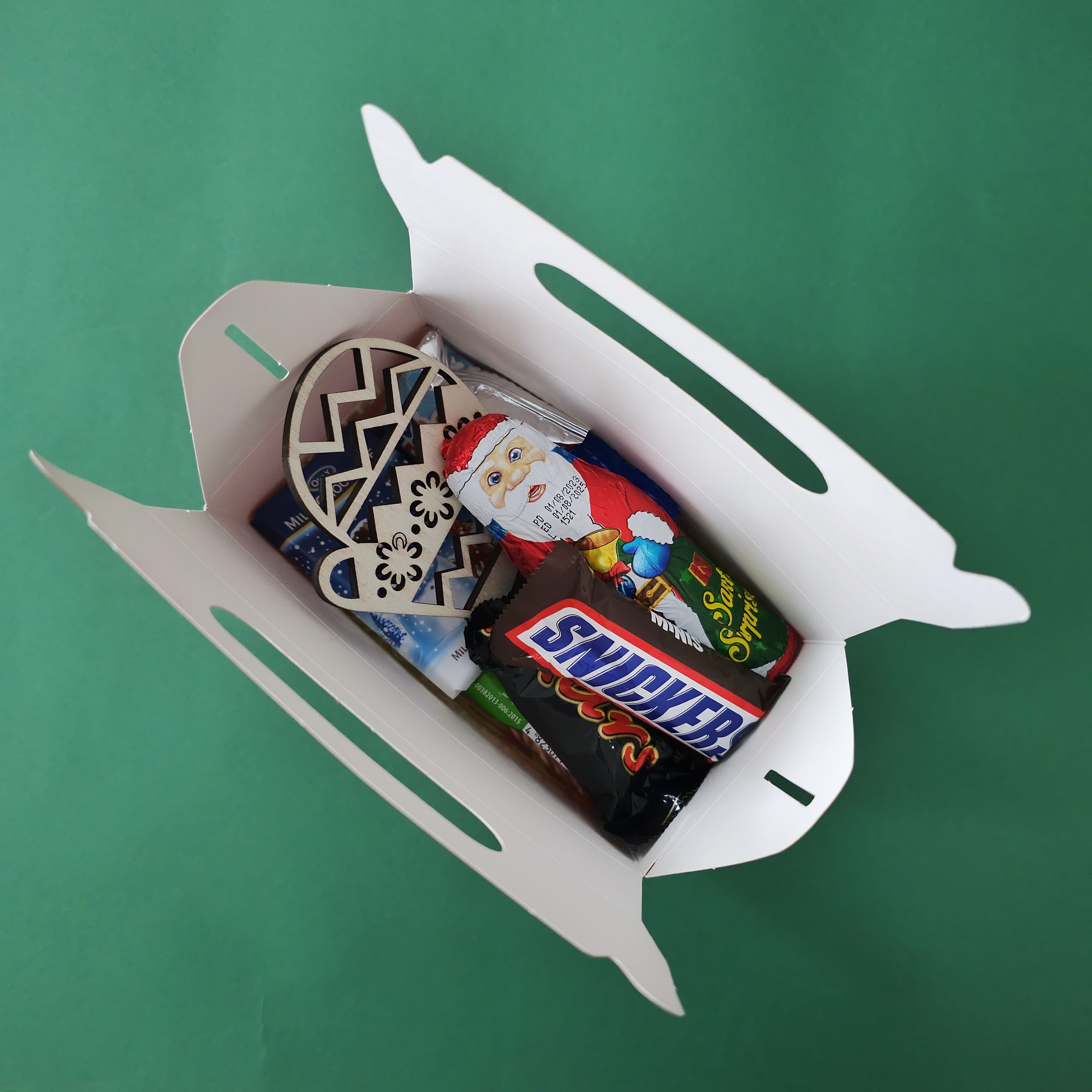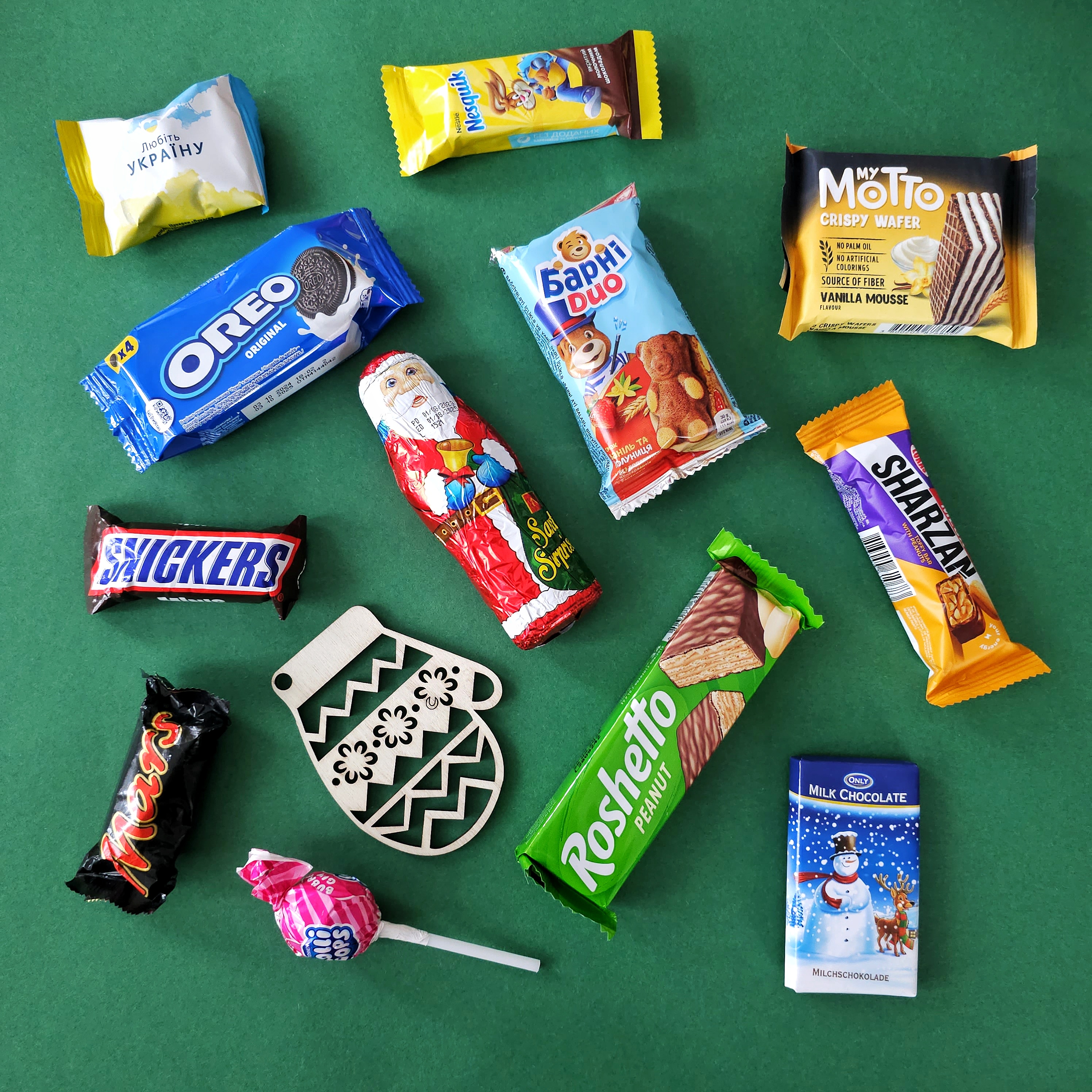 Печиво "Oreo" – хрустке та ніжне, улюблене багатьма. Mini батончики "Snickers", "Mars", "Nesquik" – маленькі порції великого задоволення. Бісквіт "Барні" – легкий та смачний перекус із кремовою начинкою. Молочний шоколад "Only" – ніжність у кожному шматочку. Фігурка Санта з молочного шоколаду – символ Різдва, що створює святковий настрій. Батончик "Sharzan" – для любителів горіхових ласощів. Вафлі Roshetto глазуровані – солодкий хрусткий вибір. Вафлі "Motto" – ідеальний баланс ніжного крему і хрусткої текстури. Карамельний льодяник "Lollipops" – класика для справжніх ласунів. Цукерка – маленький солодкий сюрприз. Дерев'яна іграшка – пам'ятний сувенір для прикраси ялинки.