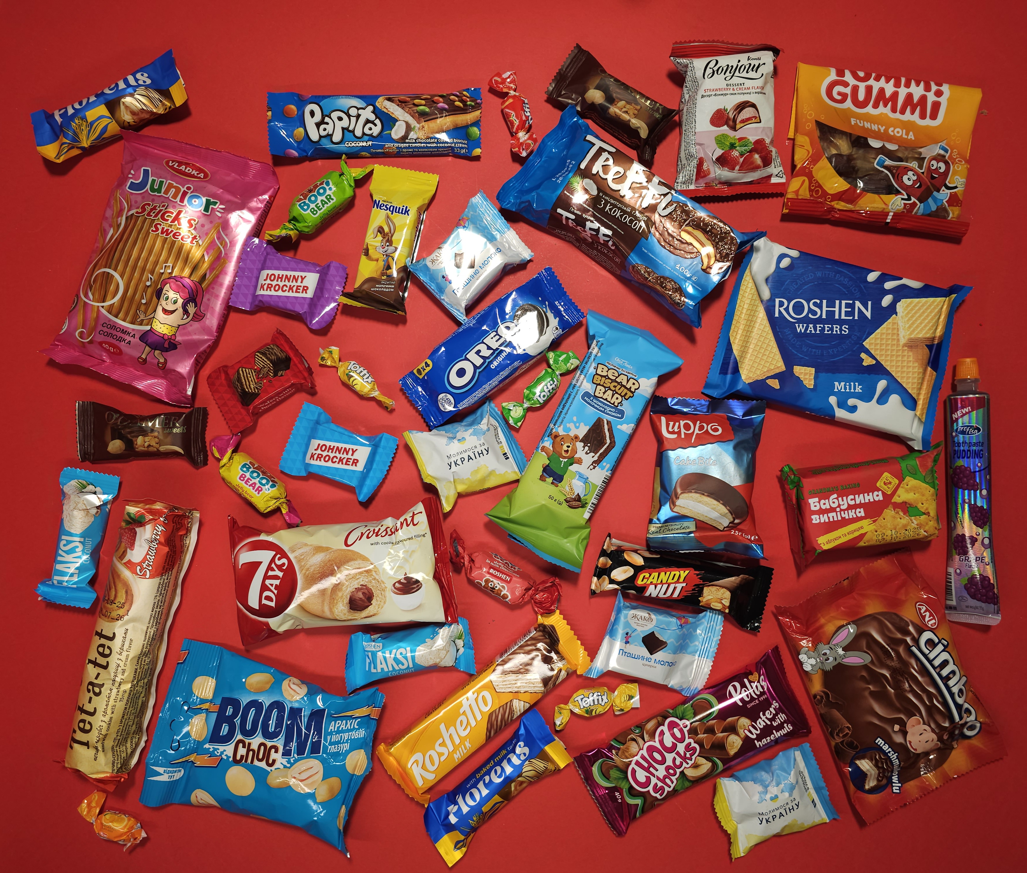 - вафлі "Roshen Wafers Milk", 1 шт. - вафельний батончик з горіхами в молочному шоколаді "Choco Shocks" - арахіс у глазурі "Boom Choc" - цукерка "Candy Nut" - цукерки вафельні глазуровані "Johnny Kroсker", 3 шт. - печиво з молочним кремом и драже "Papita Coconut" - цукерки з вафельними вівсяними пластівцями та кокосом "Flaksi", 2 шт. - вафельний батончик в шоколаді "Roshetto" - цукерки вафельні "Florens", 2 шт. - жувальні цукерки "Toffix", 4 шт. - печиво "Oreo Original" - солодка соломка "Junior Soft Stick Sweet" - печиво "Tet-a-Tet" з полуничною начинкою - круасан "7 Days" - печиво затяжне "Бабусина випічка" з яблуком та корицею - печиво "CIMBOO" з маршмеллоу у какао глазурі - печиво цукрове "Treffi" в шоколадній глазурі - десерт бісквітний "Bonjour" зі смаком полуниці - mini-батончик "Nesquik" - цукерки желейні "Roshen Boo! Bear", 3 шт. - цукерки "Любіть Україну", 2 шт. - цукерки "Lukas O'Damer", 2 шт. - цукерки глазуровані "Пташине молоко Жако", 2 шт. - тістечко бісквітне "Bear biscuit bar" з шоколадно-молочним смаком, 50 г - желейні цукерки "Gummi Funny Cola" - Pudding у тюбику “Grizzy” - міні-кекс Solen "Luppo Cake bite Mini" маршмеллоу и шоколад