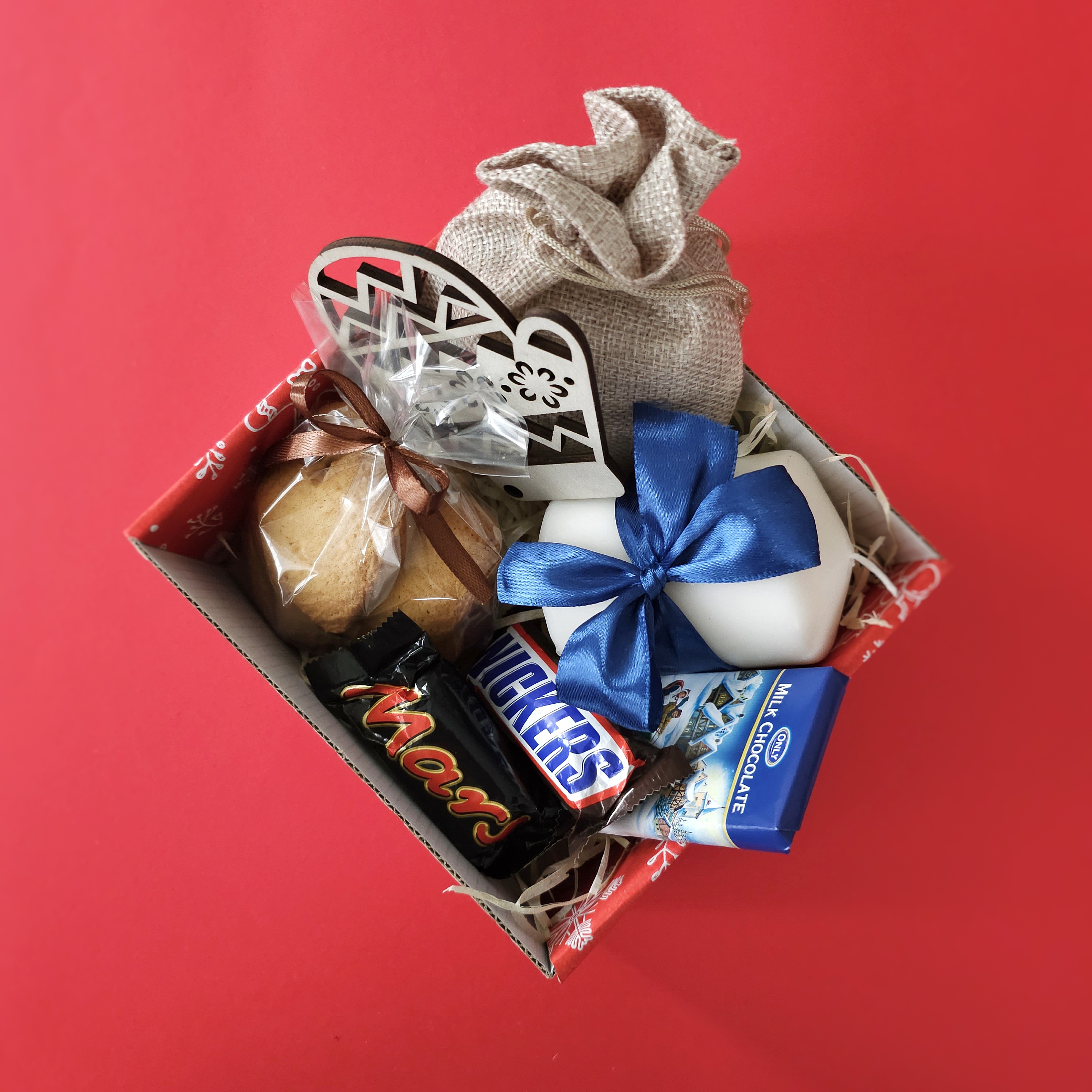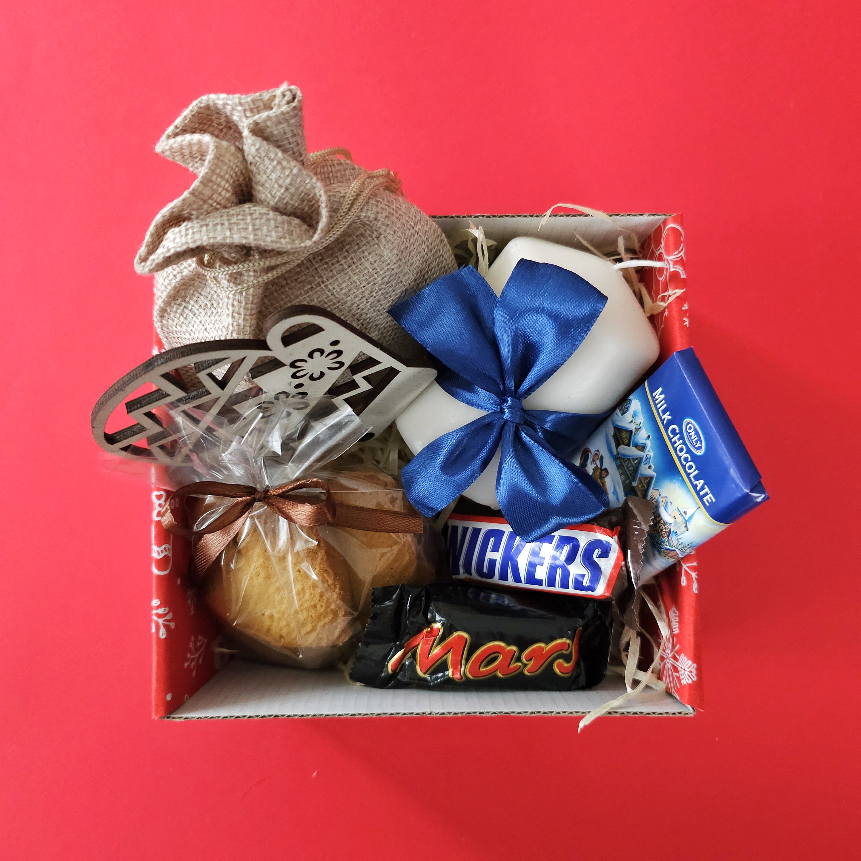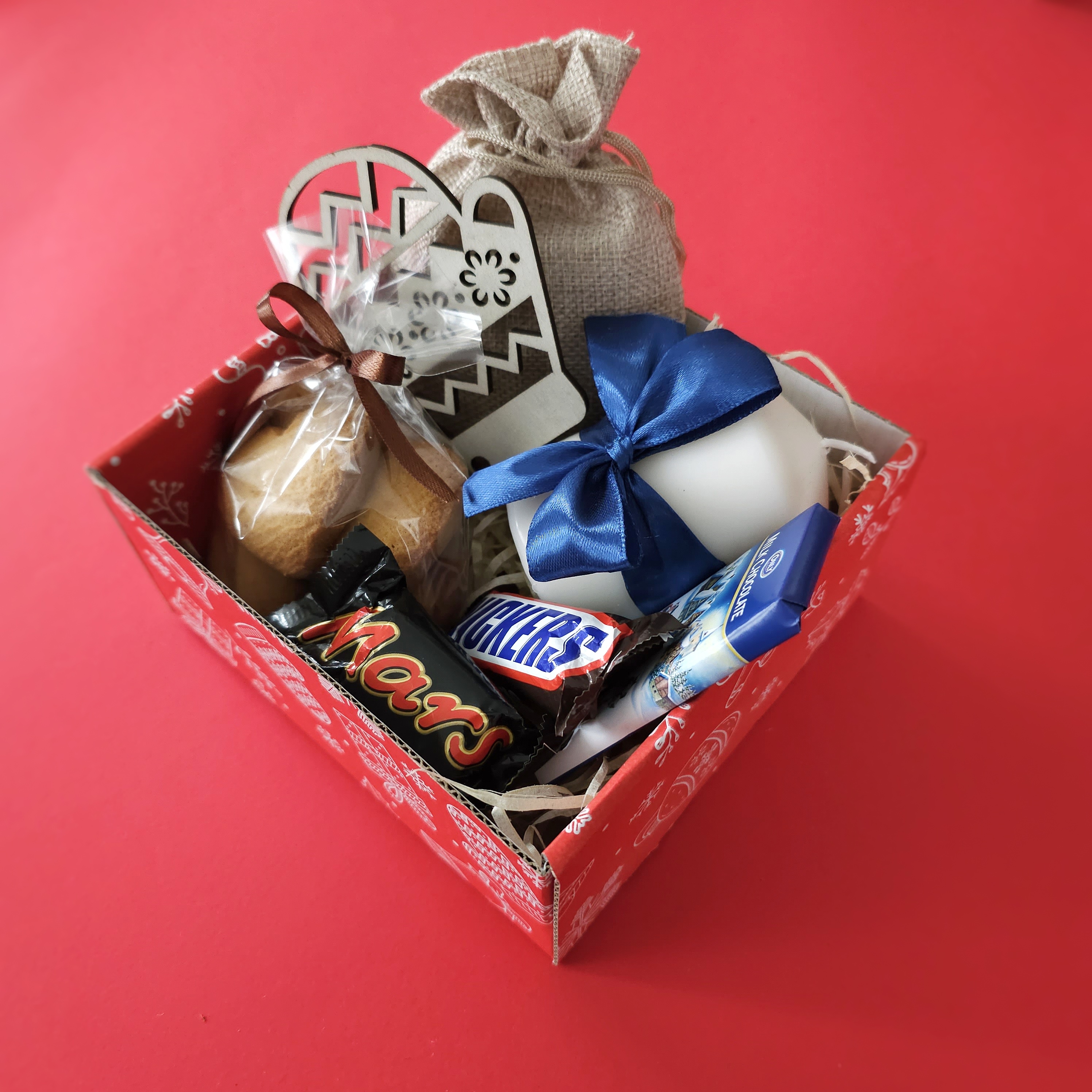 Запашна кава - напій, який дарує справжнє задоволення та затишок. Смачне печиво — ніжний смак, який чудово доповнює чаювання. Mini "Snickers" і "Mars" — улюблені ласощі, що подарують солодку насолоду. Молочний шоколад "Only" — справжнє задоволення для любителів класичних солодощів. Свічка для святкової атмосфери — додасть нотку затишку та тепла. Дерев'яна іграшка — приємний святковий сувенір, який стане прикрасою на ялинці або пам’ятною деталлю.